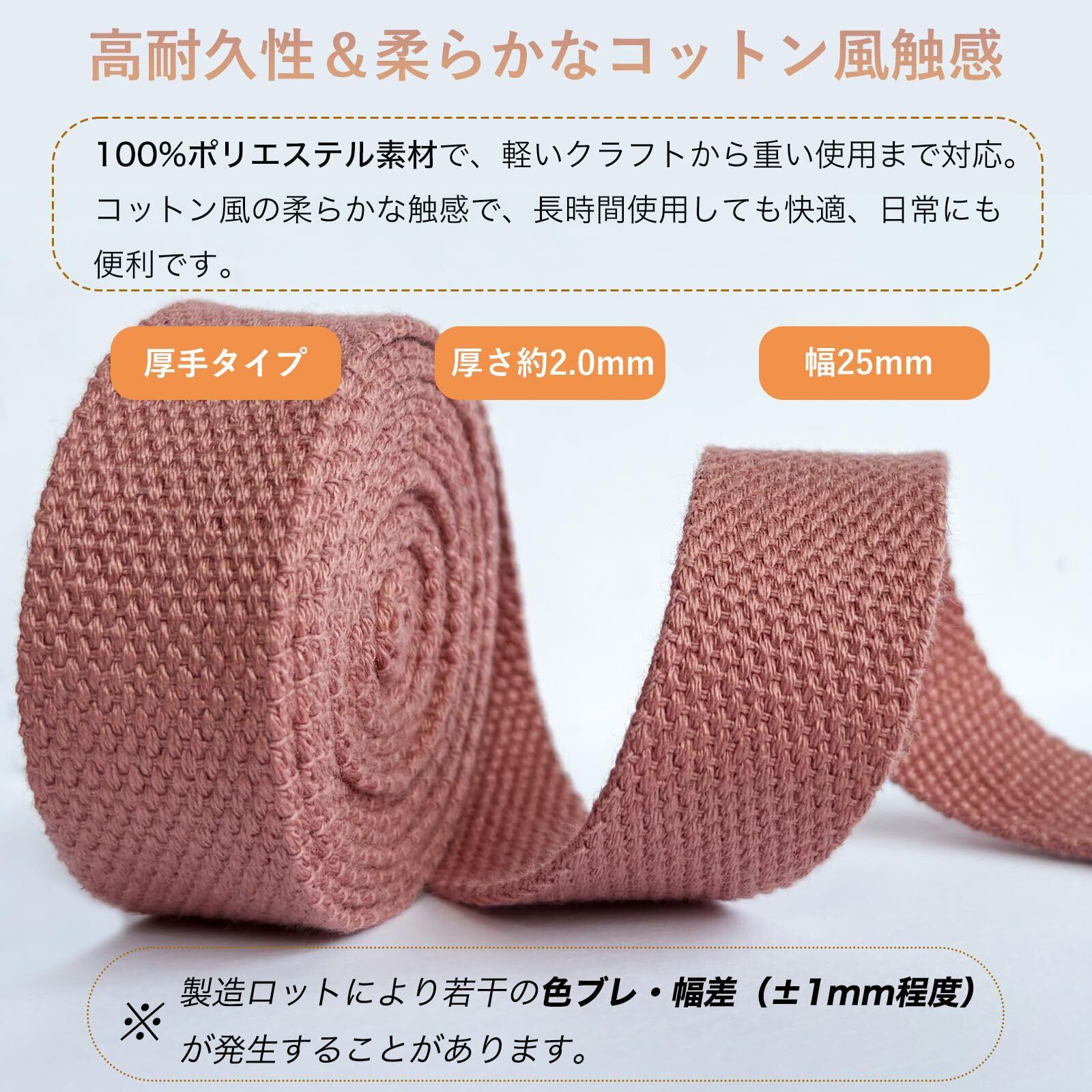 【幅サイズ】約25mmで、主にハンドメイドバッグに使用するベーシックなサイズです。お好みに合わせてハンドメイドアクセサリー作品にジャストフィットします。【ご注意】本製品はポリエステルの細い繊維の集合体でできており、生産ロットによりテンションの強弱があり幅が1-2mm前後する場合があります。ご了承の上ご注文ください。