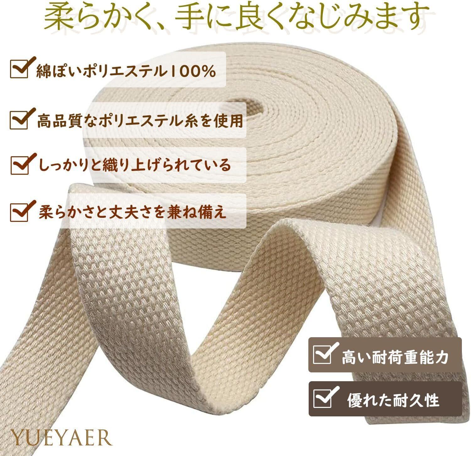 【ポリエステル綿テープ】こちらは柔らかくて丈夫なウェビングです。綿のようなポリエステル100%で、アクリルテープに似た風合いです。高品質なポリエステル糸でしっかりと織り上げられ、耐荷重能力が強く、耐久性に優れています。カバンテープやペットの首輪、作業用ベルトなど様々な用途に使用できます。【ご注意】これはPPベルト、PPテープではありません。