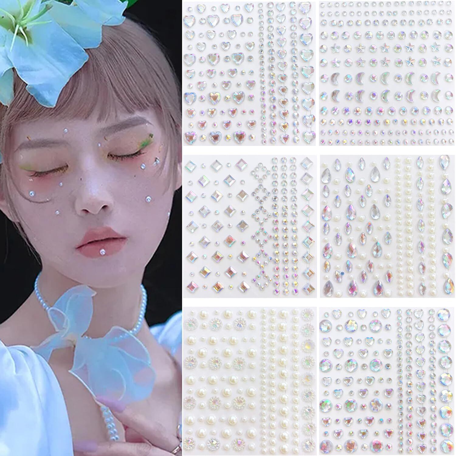 6枚 ラインストーン フェイスシール キラキラ 3D 光る セット 星 月 キラキラ 涙メイク フェイスストーン 顔面デコ ネイルデコパーツ DIY用品 自己吸着式で接着剤不要 貼り付け可能 キラキラ カラフル (白)