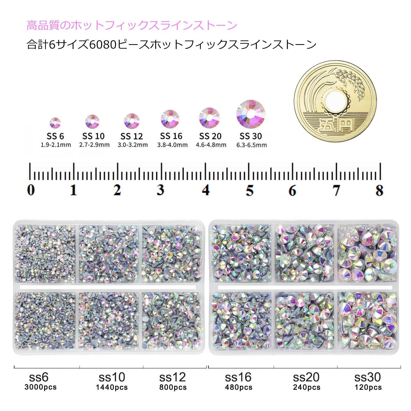 パッケージ:2箱パック、6サイズ合計6,080個のホットフィックス クリスタル ラインストーン、ワックスペンシル2本、ピンセット1本。