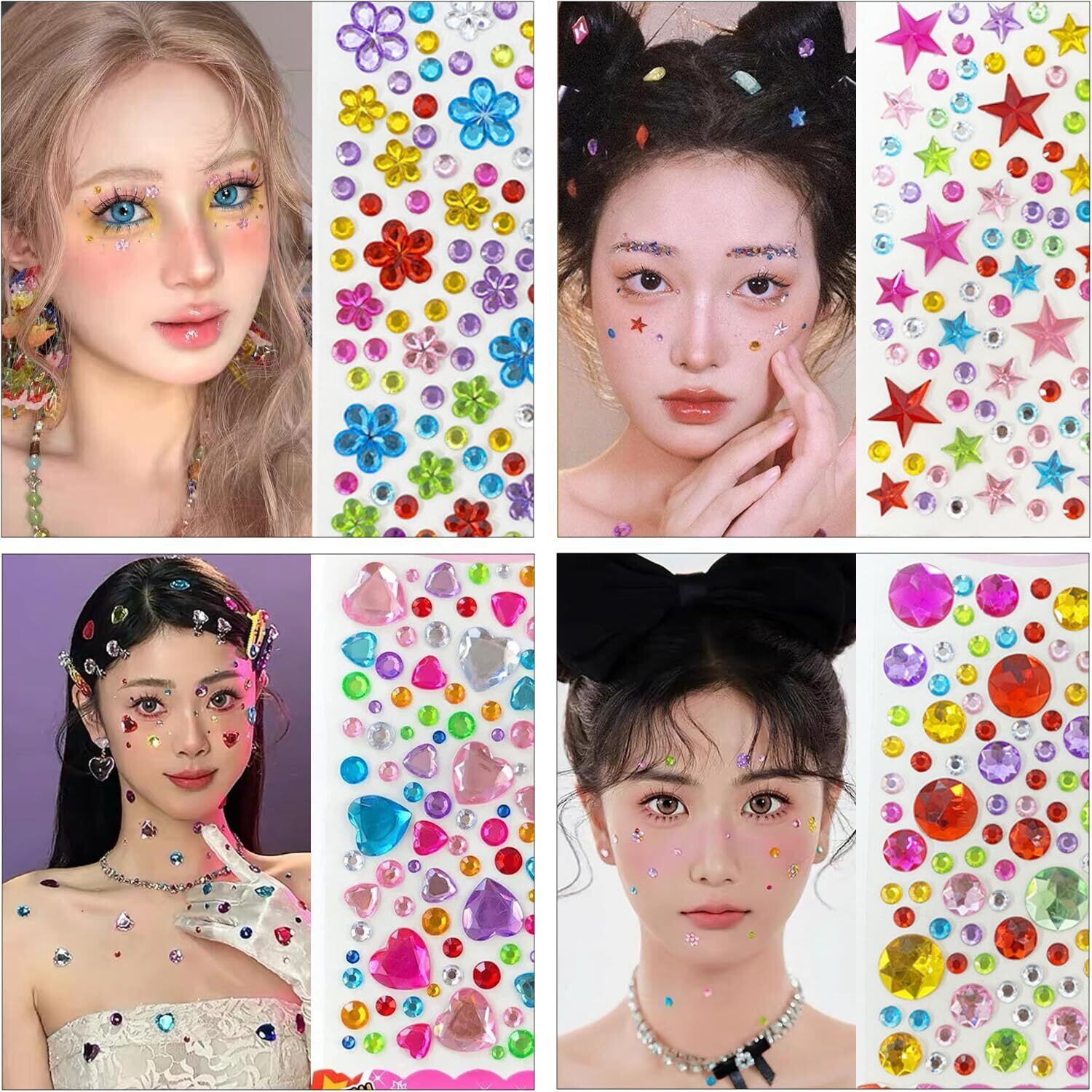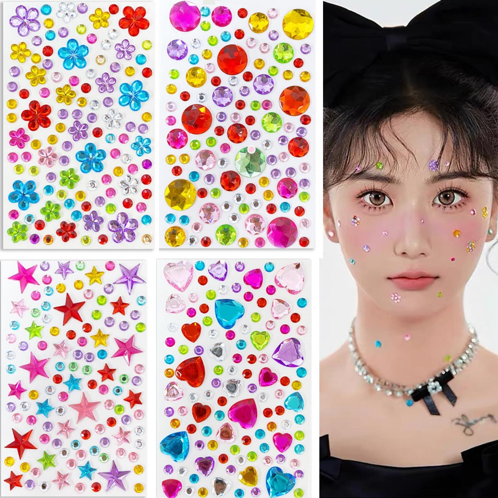 4枚 ラインストーン フェイスシール キラキラ 3D 光る セット 星 月 キラキラ 涙メイク フェイスストーン 顔面デコ ネイルデコパーツ DIY用品 自己吸着式で接着剤不要 貼り付け可能 キラキラ カラフル