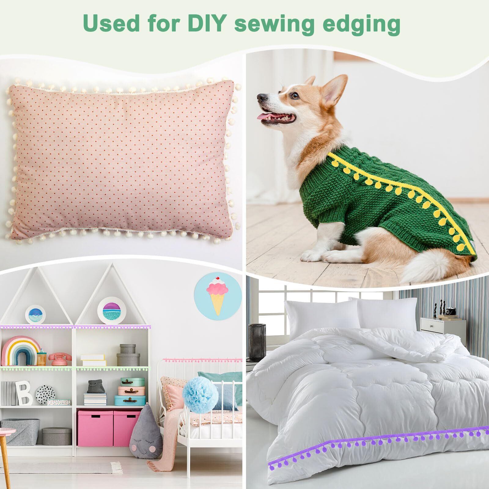 [多目的使用] - ポンポントリムリボンは、カーテン、ソファカバー、枕、またはベッドサイドテーブル、キャビネットの扉、テーブルの角などの家具の縁飾りに適しています。帽子の縁、袖口、マフラーなどのアクセサリーにも適しており、バッグ、ランタン、風船などのDIYクラフトにも使用できます。