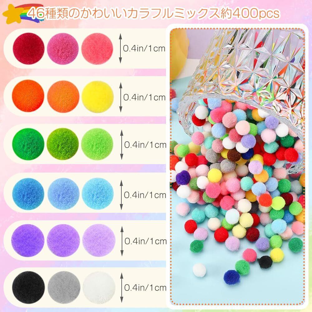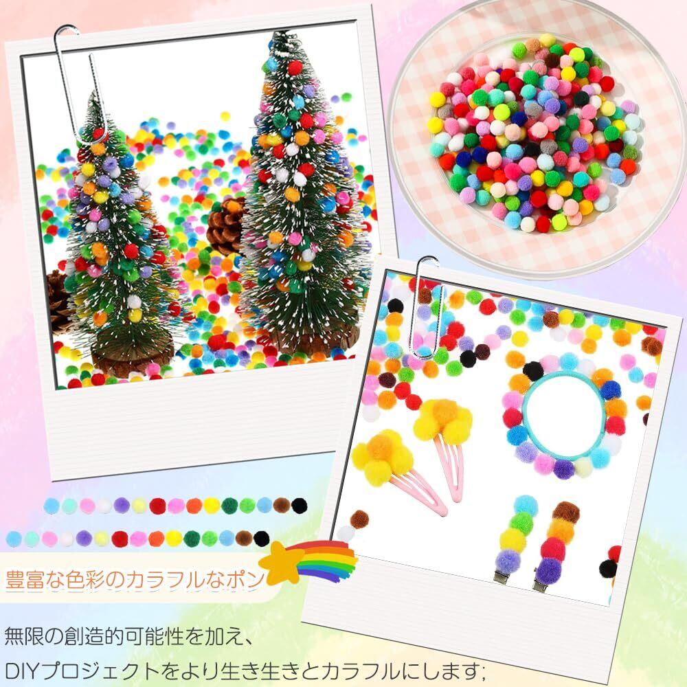 セット内容:ポンポンボール約400個セット;直径: 1cm;十分な量と豊富な色彩のカラフルなポンポン約400個をお届けします。カラフルで耐久性があるだけでなく、ソフトで心地よい手触りです。ポリエステルの耐久性はまた、これらのポンポンが簡単に変形したり、時間の経過とともに損傷しないことを保証し、あなたの装飾プロジェクトに長持ちする美しさと質感を追加します。