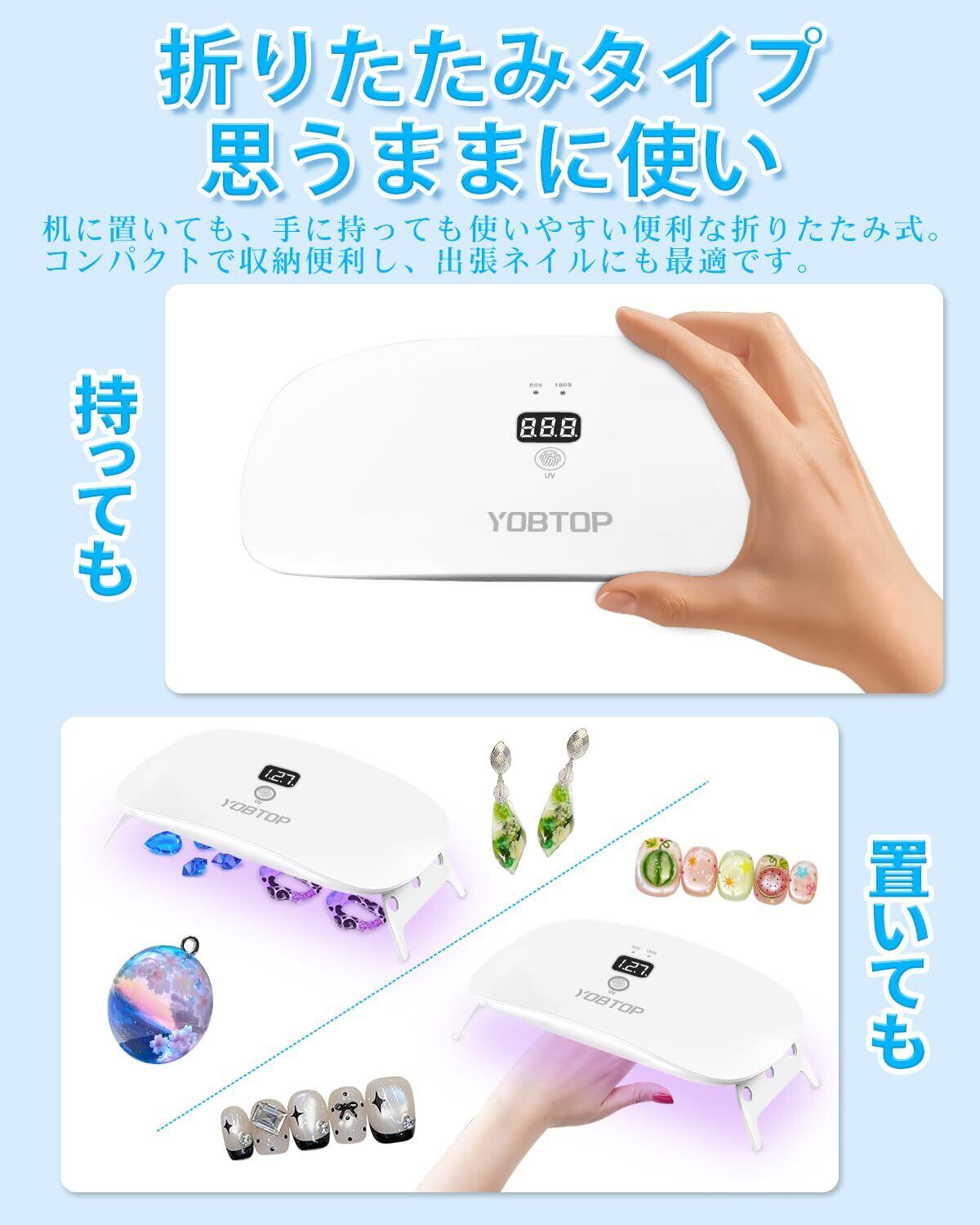【多目的使用】UVレジンやUV接着剤の硬化だけでなく、 ほとんどすべてのジェルの硬化範囲に対応しています。手足両用、強力な硬化効果を持ちつつ、肌や目を優しく保護します。ベースジェル、トップジェル、カラージェル、ジェムストーンジェル、UVレジンなど、ほぼすべてのジェルタイプに対応します。