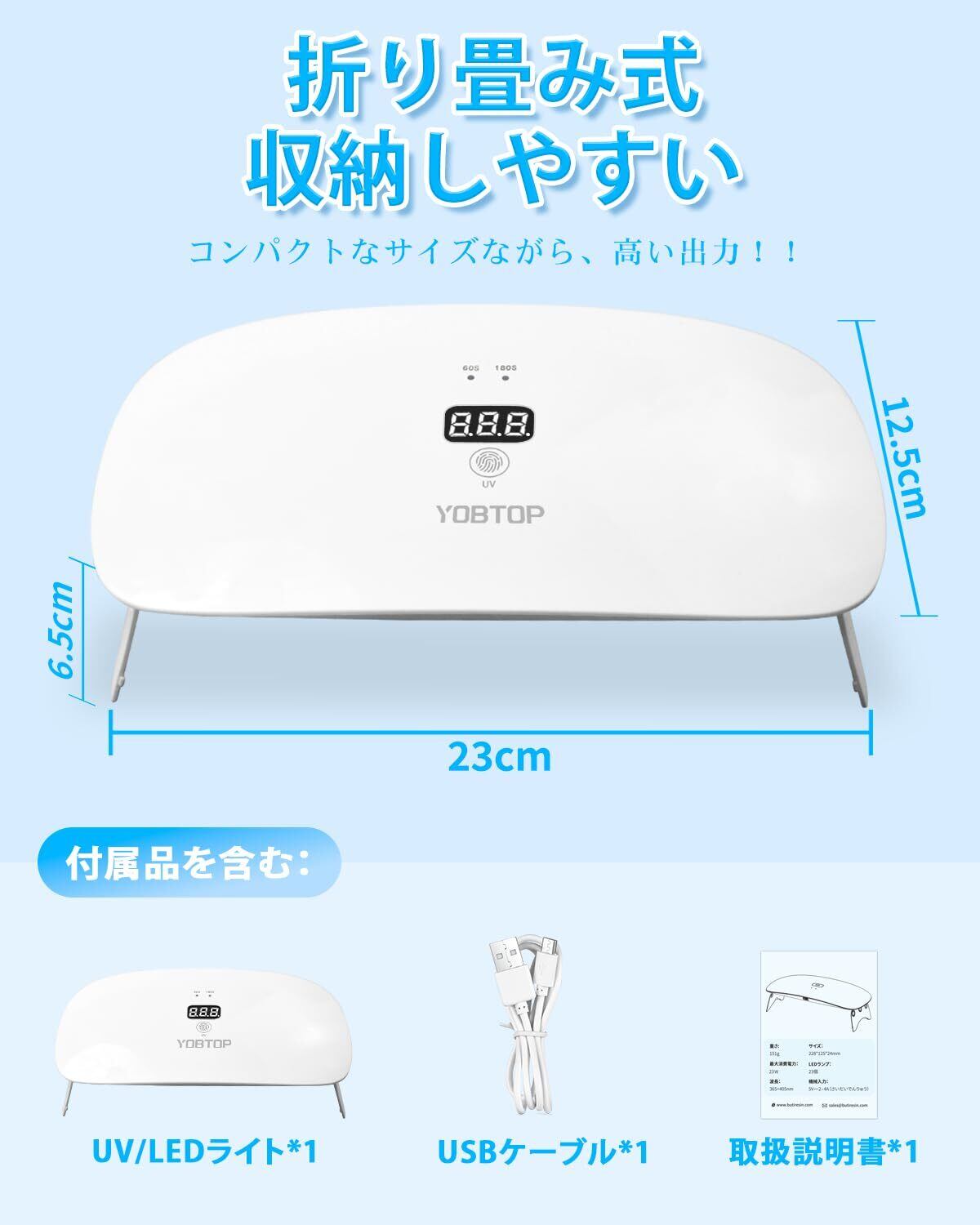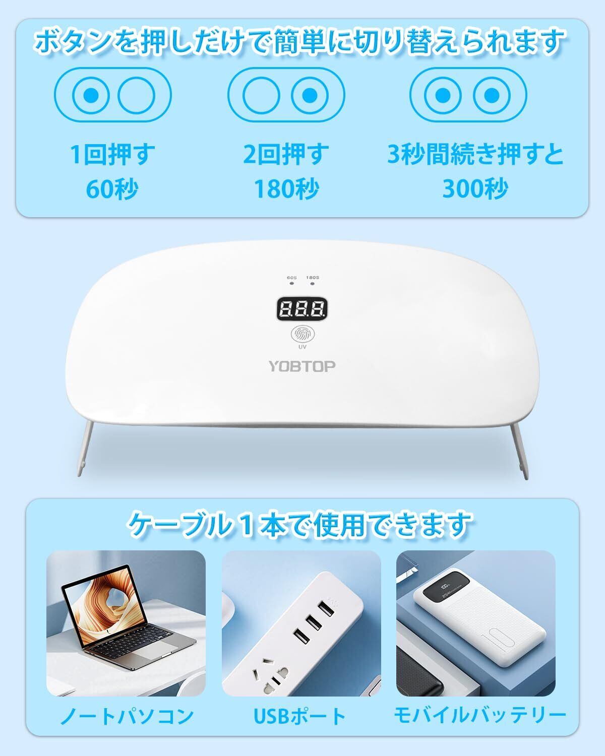 【2段階タイマー】uvライトには60秒、180秒の2段階タイマーが搭載されており、ニーズや好みに応じて選択することができます。スイッチをを毎回押すと、60秒、180秒硬化モードが切り替え、最長180秒をカスタマイズしたため、何度も操作を繰り返す必要はありません。
