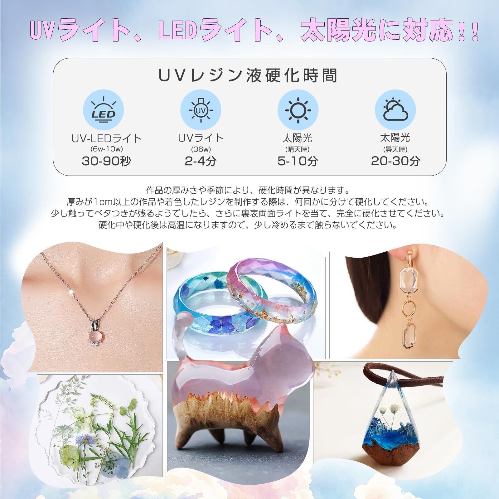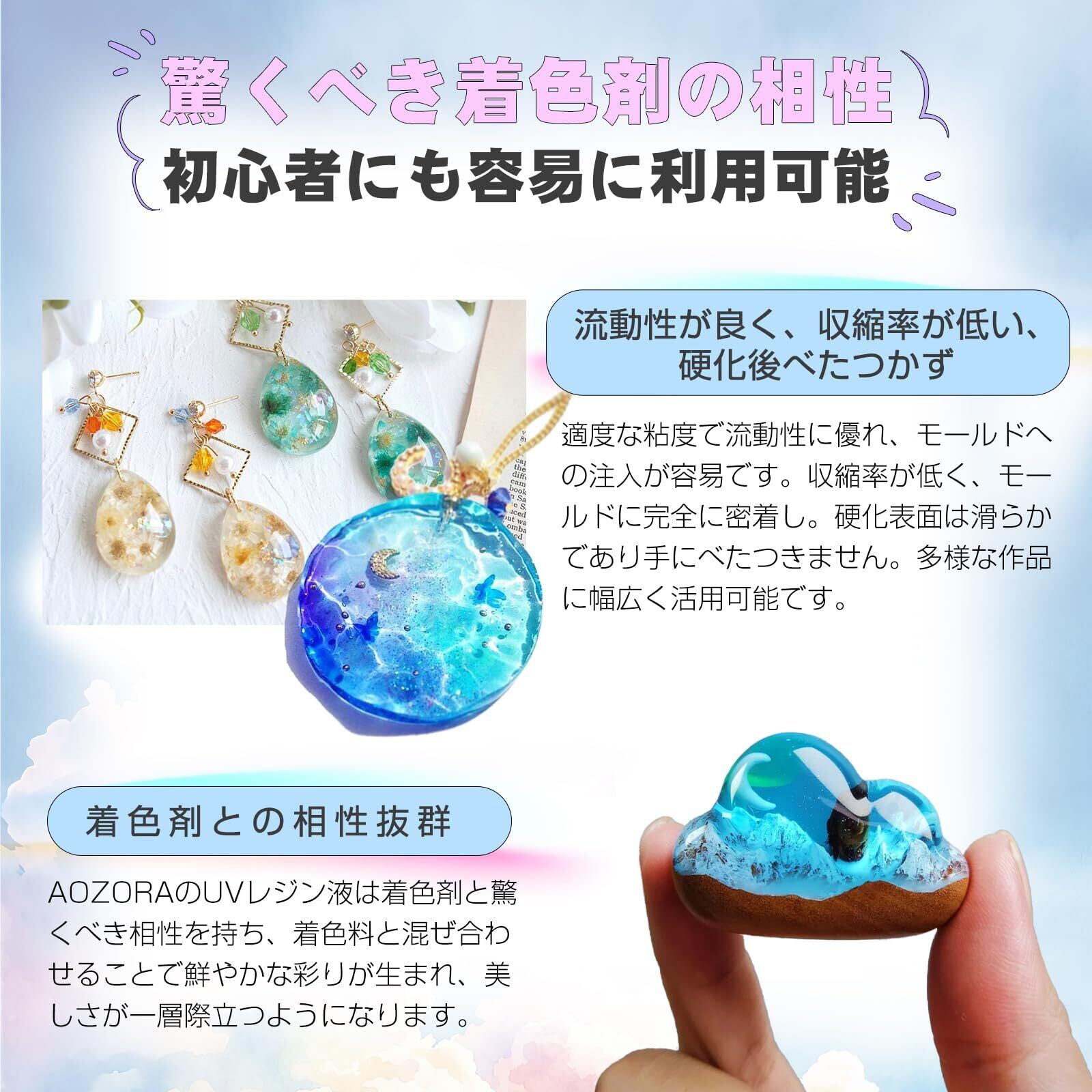 【 DIYの多用途化】AOZORAのレジン液は大容量でコストパフォーマンス、初心者でも安心のたっぷりサイズ。練習も、大作も、コストを気にせず思いのままに、アートジュエリーDIY手作りの制作、金型鋳造、レジンコーティング、工芸品装飾などに非常に適しています。お気に入りのアクセサリーにユニークな魅力を添えたいときや手作り品を作りたいときにもご利用いただけます。