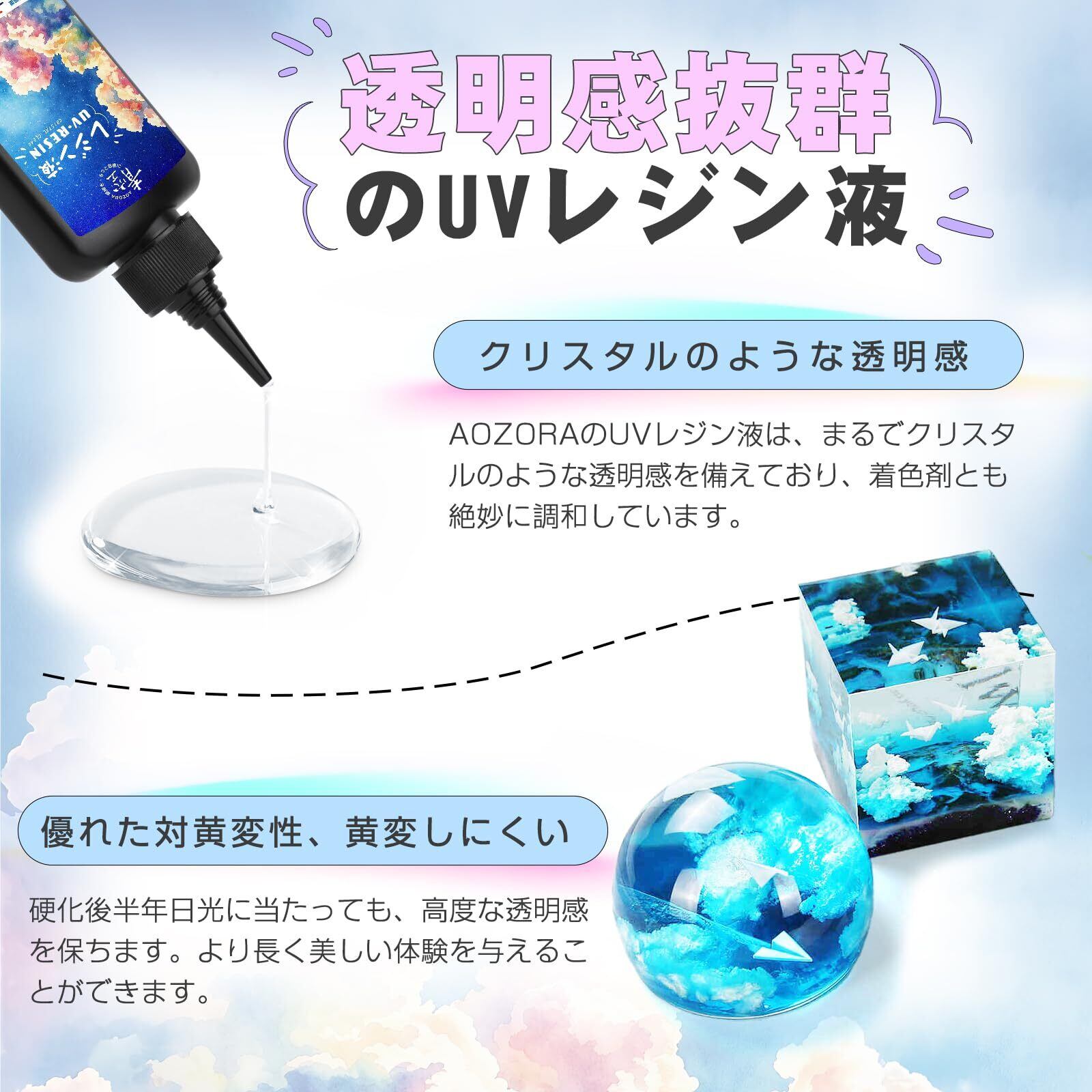 【極 上の透明感&優れた耐黄性】AOZORAのレジン液は水のような透明さを持ちます。着色剤との相性も優れており、発色は非常に鮮やかです!作品をかんぺきに表現することができます。また、黄変性能も優れています。長時間使用しても新しいような透明さを保ち、あなたの作品の魅力を長く引き立てます。