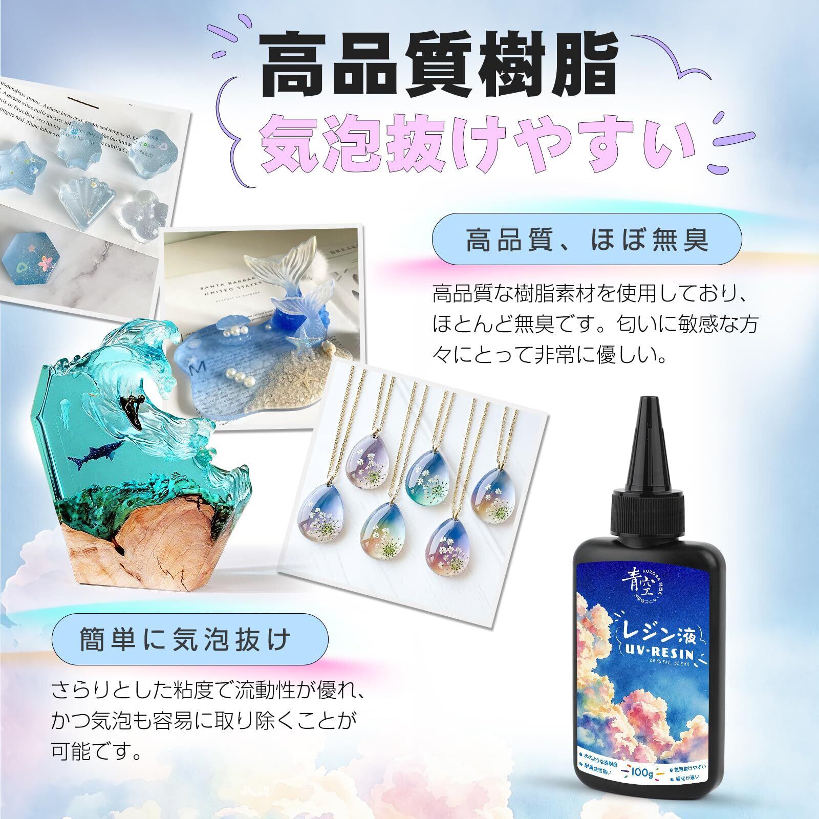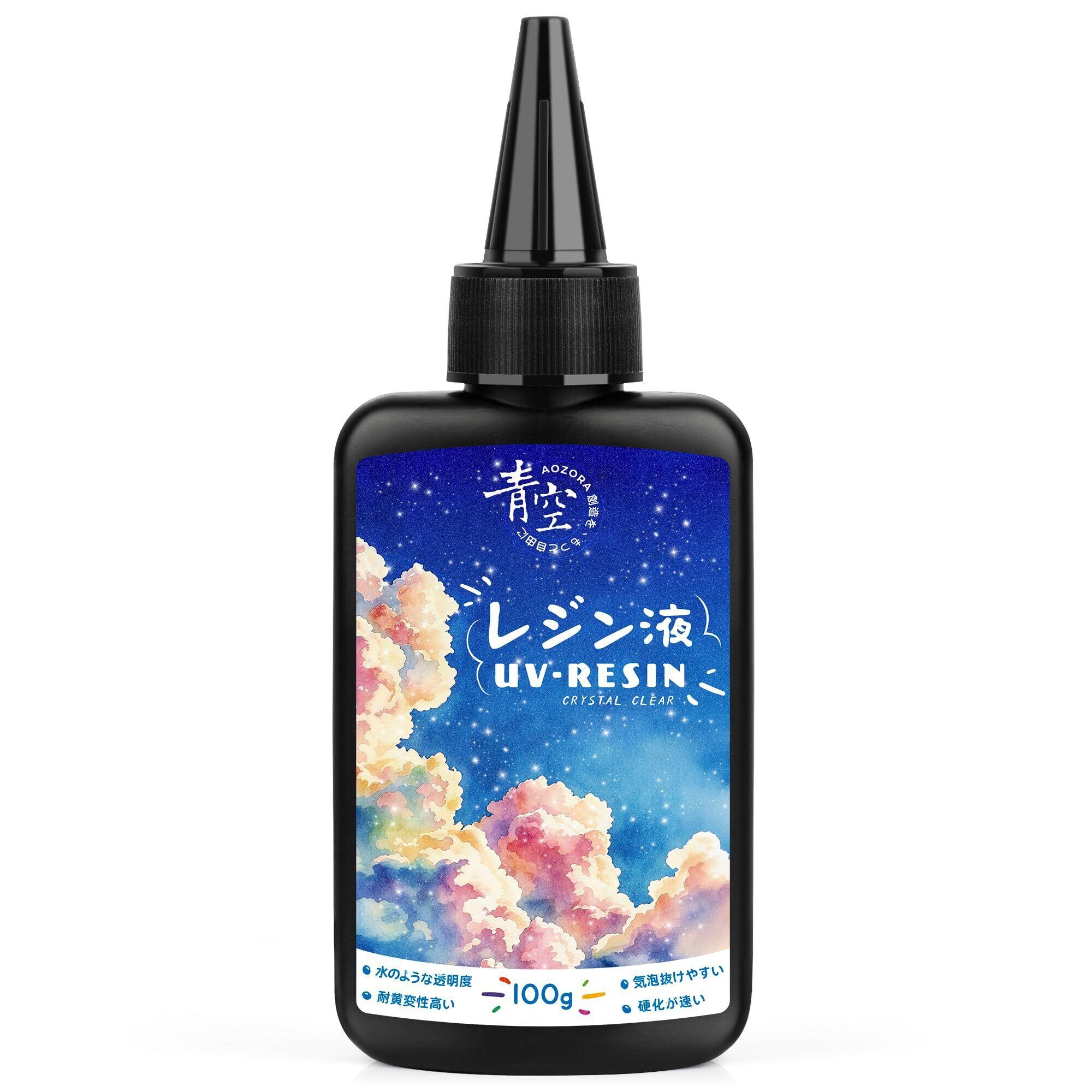 レジン液 100g UV/LED対応 レジン 高い透明度 エポキシ樹脂 大容量 詰替用 ハードタイプ成形 急速硬化 レジン液 低粘度 サラサラ 黄変しにくい 初心者向け DIY手作り クラフトなど適用 AOZORA