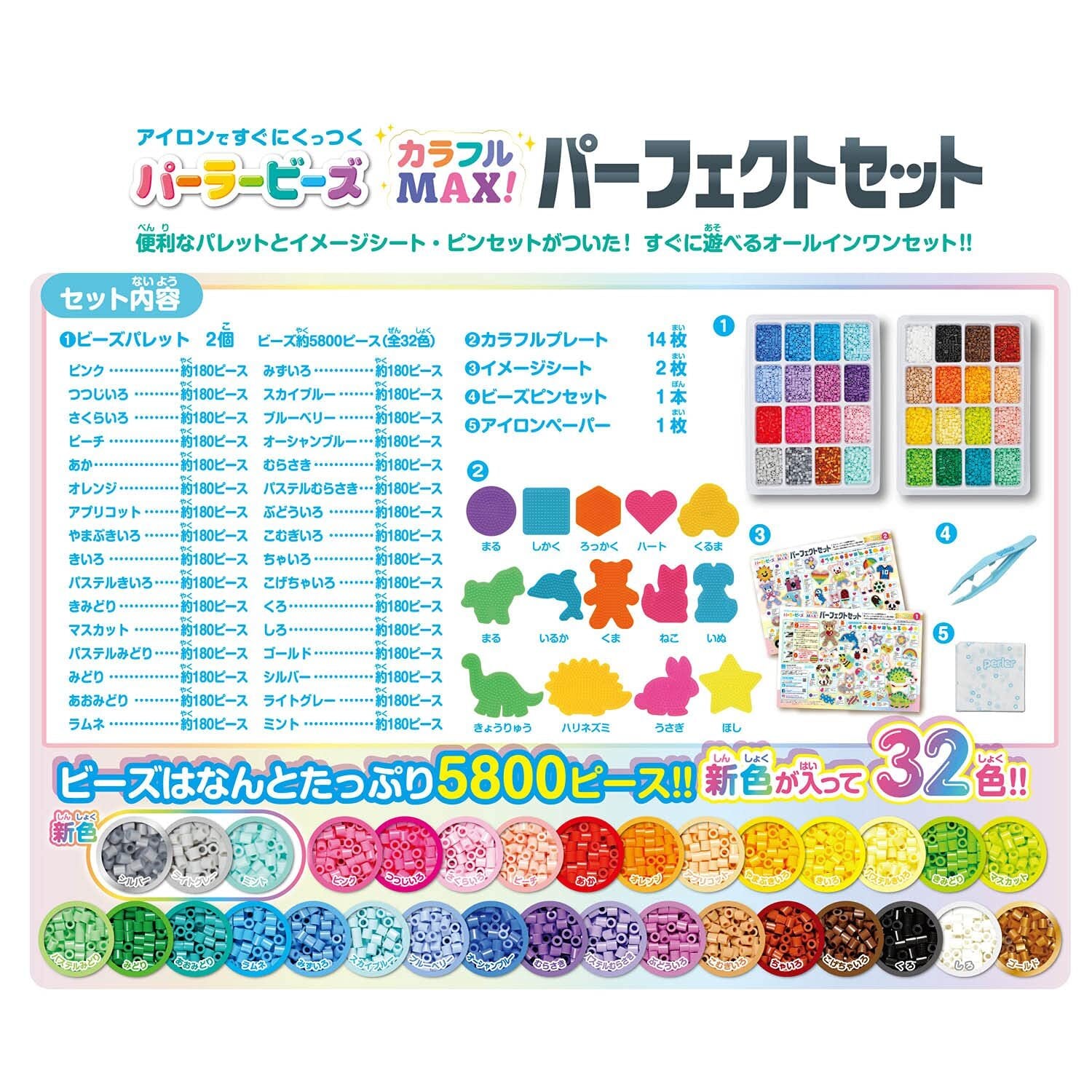 【セット内容】ビーズ全32色5800ピース、ビーズパレット×2、カラフルプレート14種(しかく、まる、ろっかく、ハート、ポニー、いるか、きょうりゅう、ほし、ハリネズミ、くるま、くま、いぬ、ねこ、うさぎ)、イメージシート×2、ビーズピンセット×1、アイロンペーパー×1