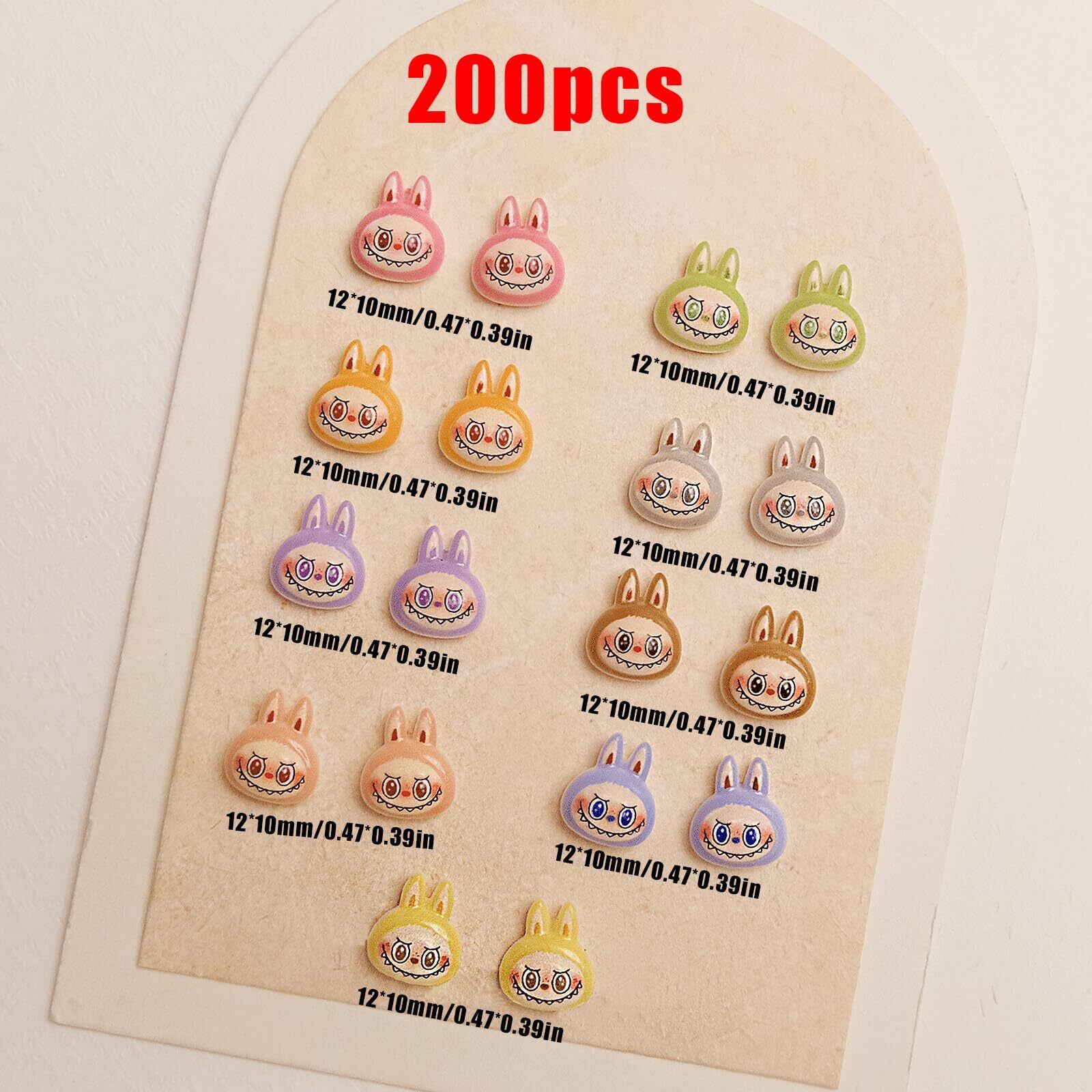 【素材】高品質の安全な材料を使用。肌や爪に刺激が少なく、立体的に作られた耳や表情が、ネイルにぷっくりとした可愛らしさをプラス。甘めのスタイルを引き立てるアクセントになります。【貼りやすい】パーツの裏面はフラットに加工されているため、ネイルジェルや接着剤で簡単に固定でき、ずれにくいのが特徴。初めての方でも、思い通りの位置にきれいに装着できます。【ネイル以外も活躍】ネイルはもちろん、スマホケースやヘアクリップ、手帳、カードなど、さまざまな小物のワンポイントデコに。かわいいうさぎが作品に癒やしとポップな印象を添えます。【高コスパセット】普段使いのネイルから、パーティーやイベント用のスペシャルアートまで幅広く活躍。200個の大容量でコストパフォーマンスも抜群。ネイル好きの方への贈り物としても喜ばれる、可愛くて実用的なセットです。【パッケージ】ピンク、イエロー、パープルなど全8色ランダム色、195個ぐらいの大容量で登場。各パーツは12×10mmと使いやすく、たっぷりのボリュームでご自宅のネイルDIYはもちろん、サロンでの業務利用にも十分対応します。