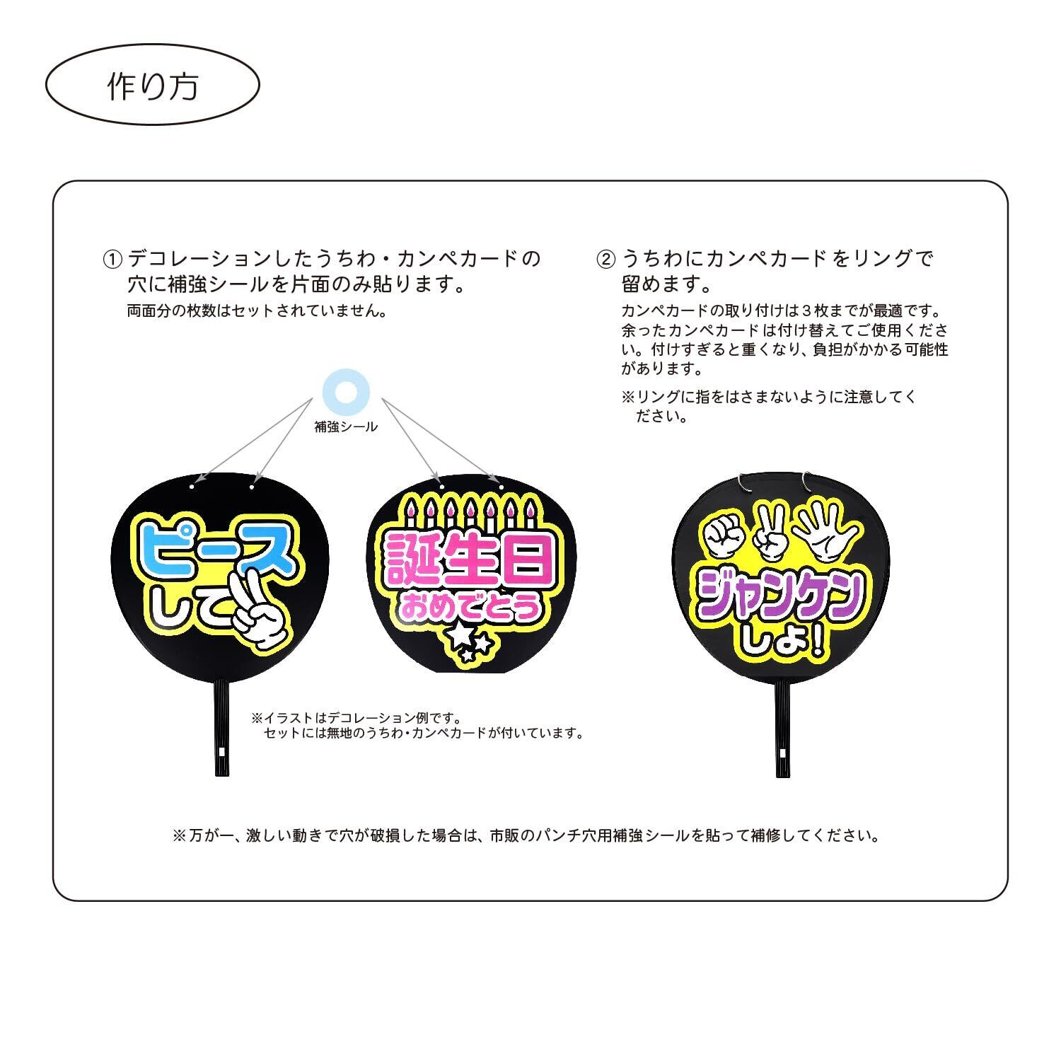 材質:【うちわ】ポリプロピレン・紙、【カンペカード】紙、【リング】鉄、【補強シール】ポリ塩化ビニル / 中国製 / ご注意:うちわへのカンペカードの取り付けは3枚までが最適です。余ったカンペカードは付け替えてご使用ください。付けすぎると重くなり、負担がかかる可能性があります。本来の用途以外に使用しないでください。うちわとしてあおいで使用したり、激しい使い方をすると破損する場合があります。リングに指をはさまないように注意してください。幼児の手の届かないところに保管してください。掲載画像のメッセージシールは商品に含まれません。
