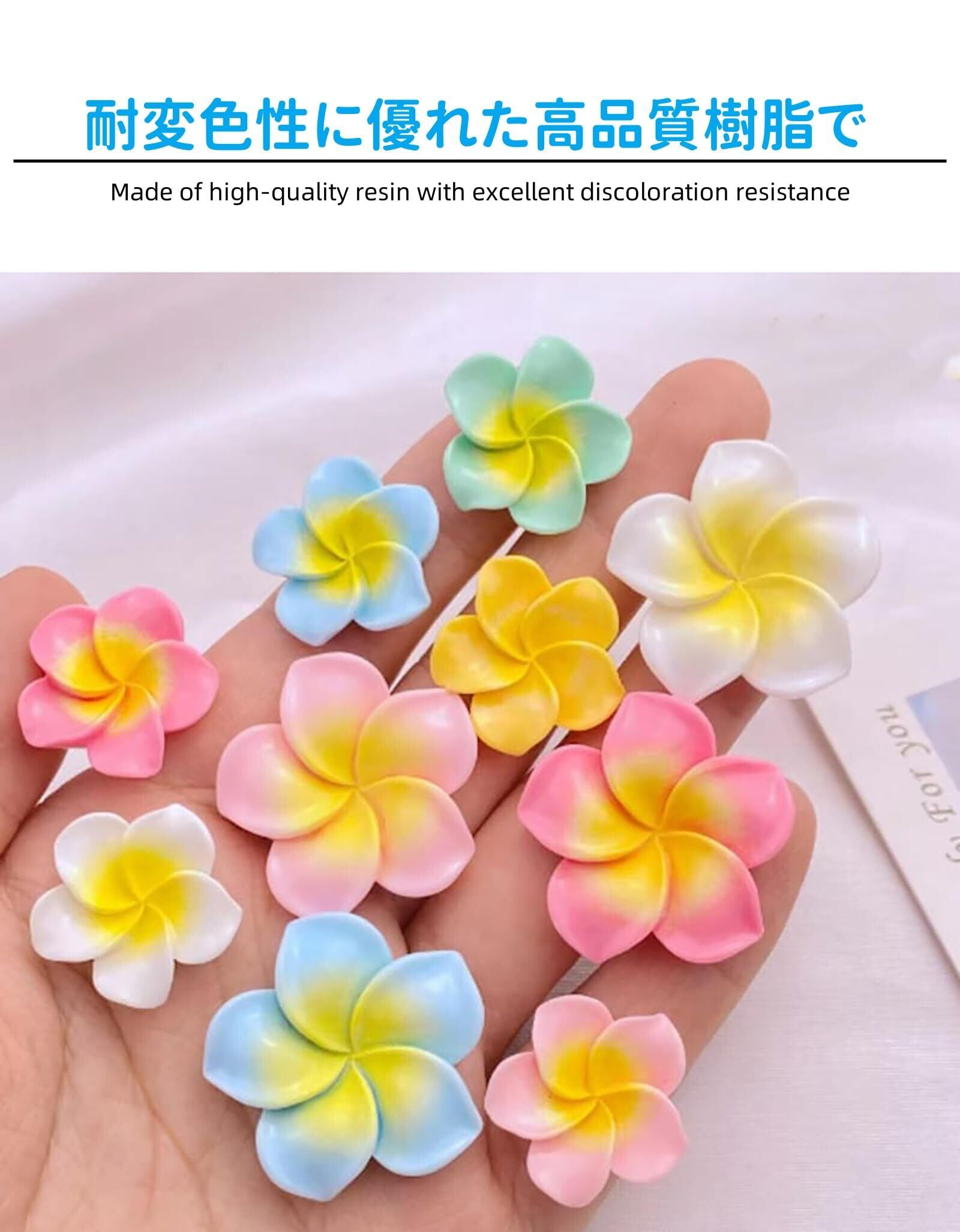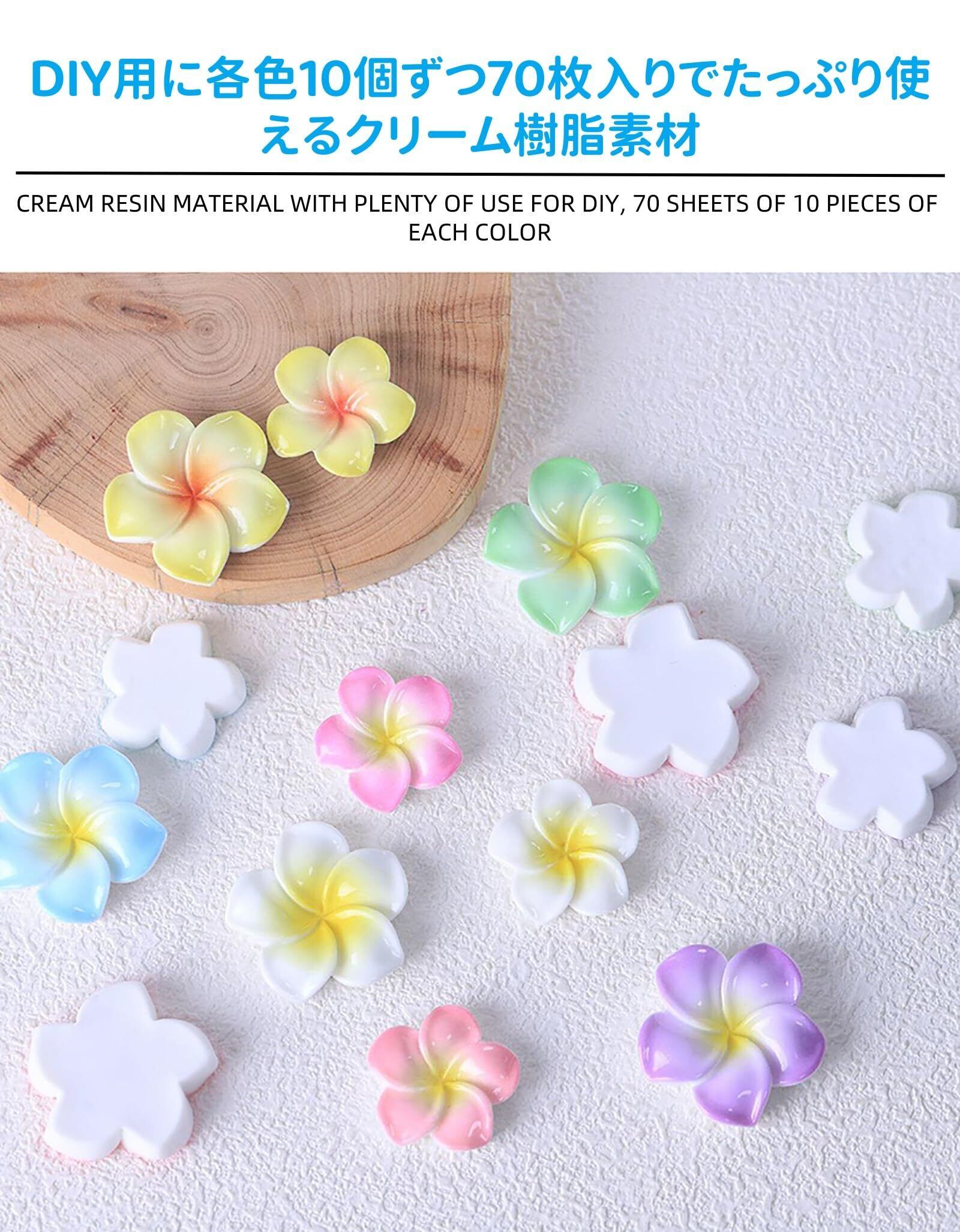 【7色アソートで自由な創作】夏のハワイアンテイストを詰め込んだ2.2cm/2.8cmの樹脂フラワー!キーホルダー・ヘアクリップ・スマホケースデコに最適な精巧な五弁花。DIY用に各色10個ずつ70枚入りでたっぷり使えるクリーム樹脂素材