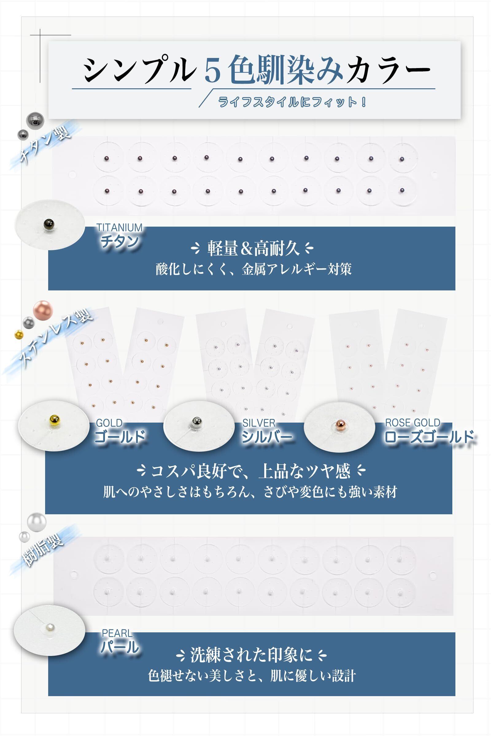 【高品質素材にこだわり】当社のチタン粒は高純度チタンを採用。酸化しにくい特性に加え、金属アレルギー対策済み。高品質ステンレス製粒(ゴールド/シルバー/ローズゴールド)は肌に優しく、さびや変色にも強く、美しさが長く持続。高級樹脂を使用するパール粒は、色褪せない美しさを実現しながら、肌への負担を軽減。表面のジュエリーパーツには上質な天然素材を厳選使用。敏感肌にも安心の肌に優しい設計で、高い耐久と快適な装着感を両立