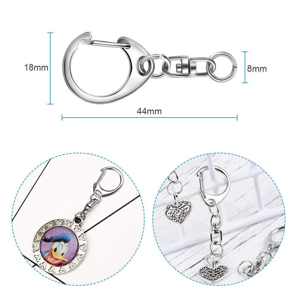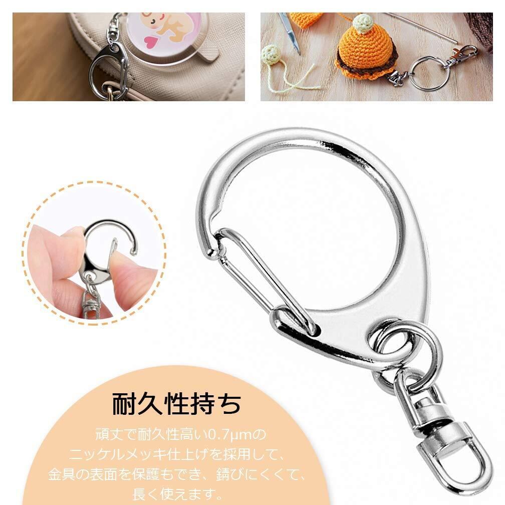 【パッケージ内容】キーホルダー金具*50個。サイズ:全長約45mm、幅約20mm、丸カン:内径6mm×線径1mm。ナスカン:(縦・外寸)約24mm、(横・外寸)約18mm。