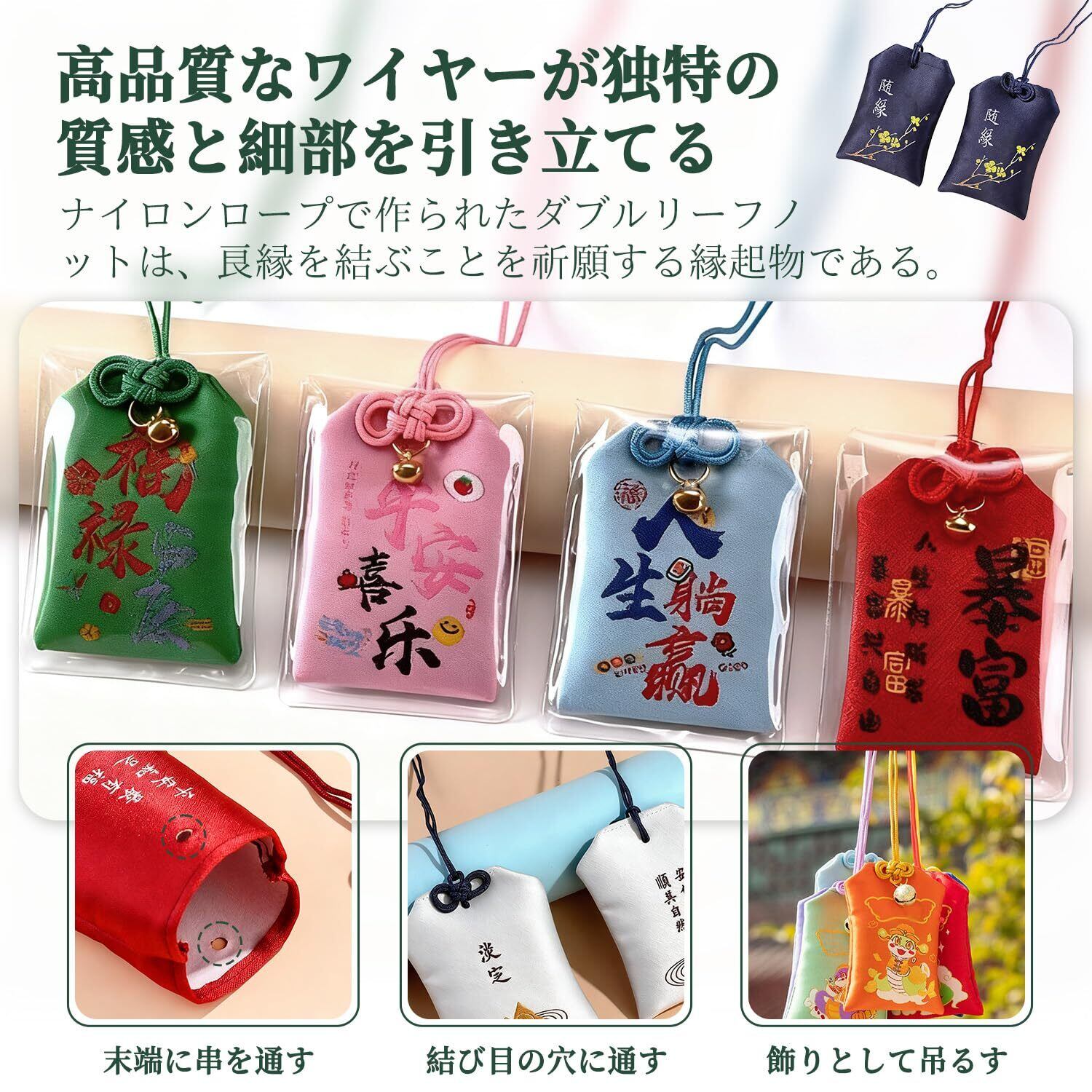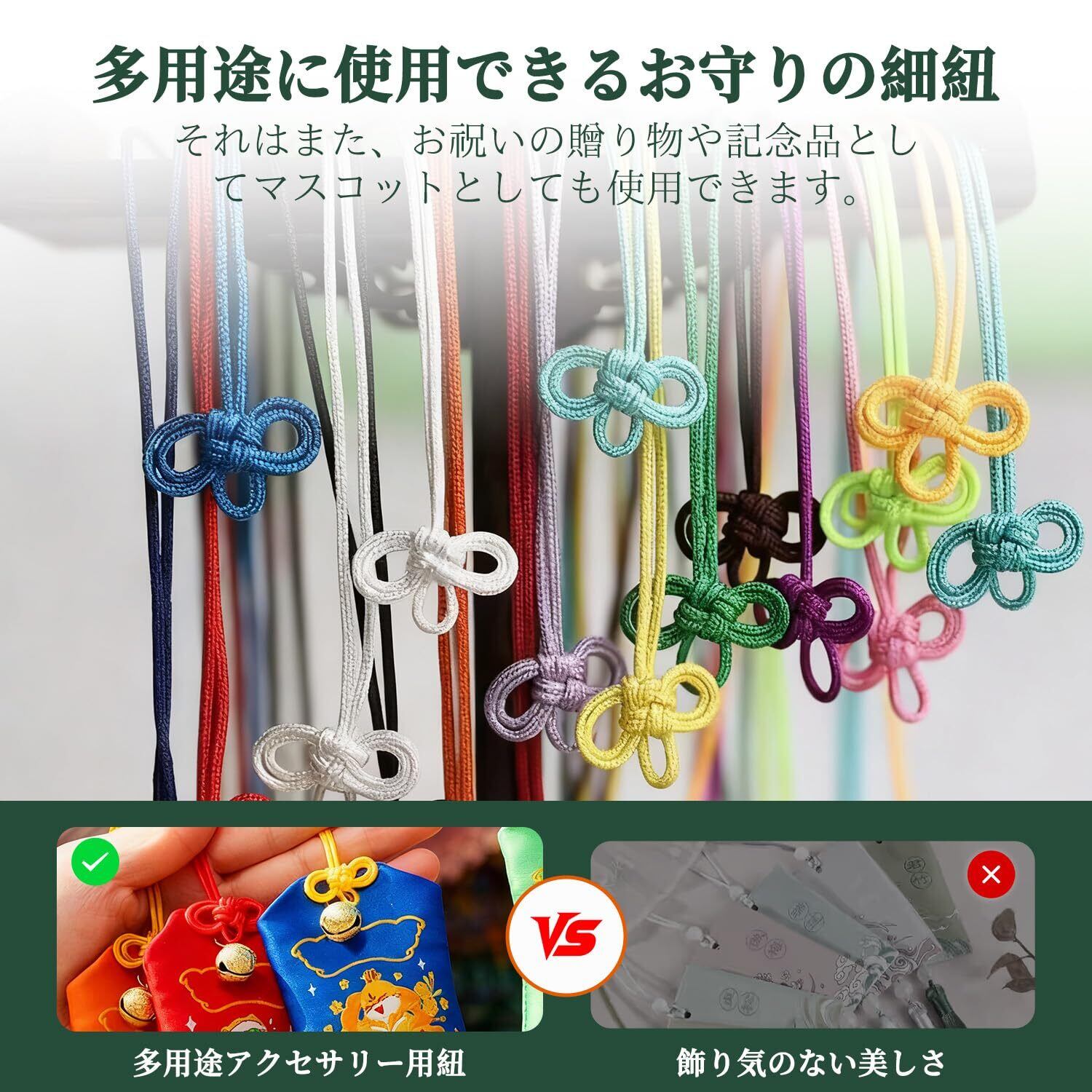 【多彩な活用シーン】お守り袋や香袋、縁起物マスコットの製作に、バッグやキーホルダー、着物の帯留めとしてのストラップに、和テイストのしおりやランプの飾り紐として、卒業、入学祝いや各種お祝いのギフト包装のアクセントに。