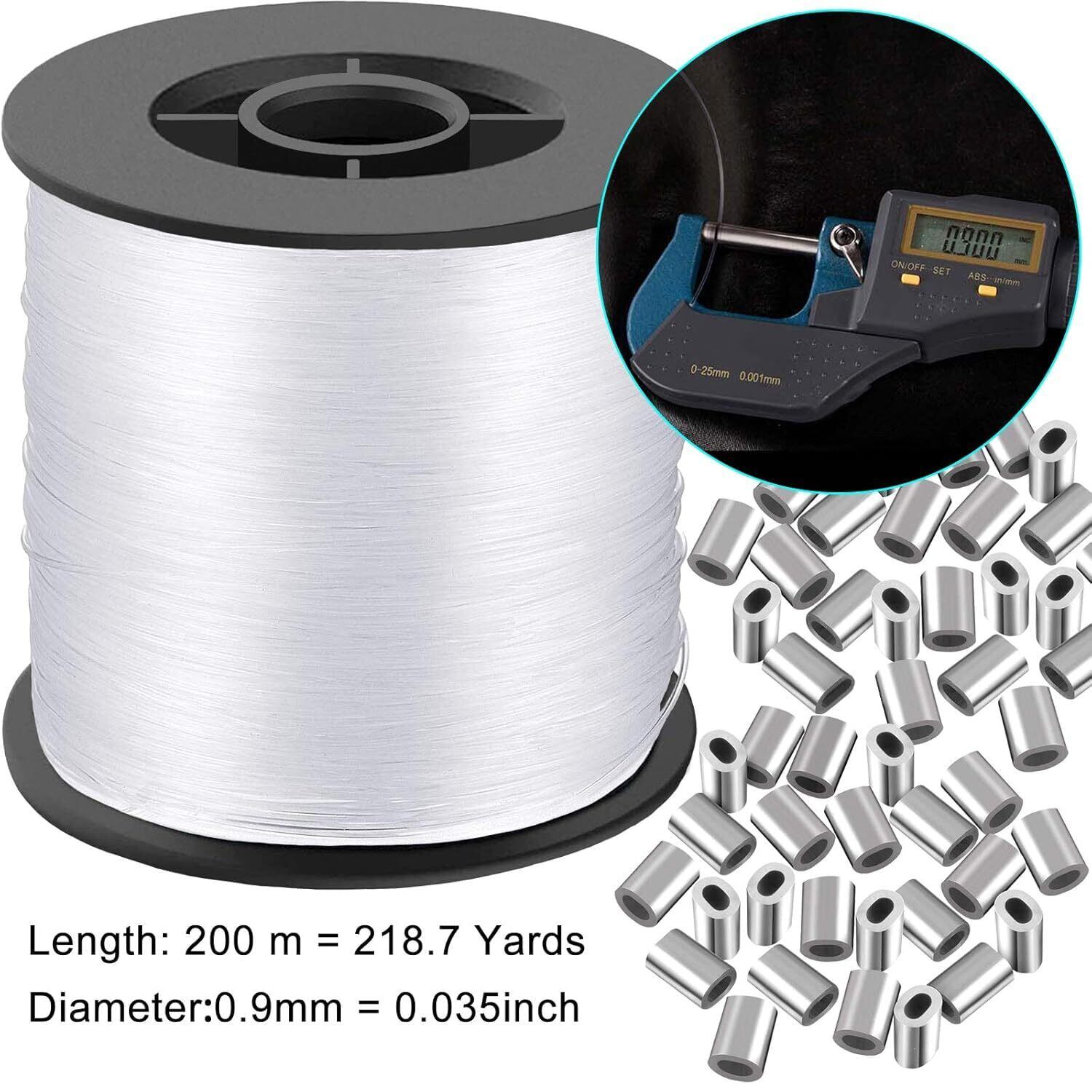 透明で目に見えない吊り下げワイヤー 0.9mm 最大60ポンド 656フィート (200m) ビーズソーイングオーナメント用 丈夫なナイロン糸 アルミニウム圧着スリーブ60個付き 写真フレーム用吊り下げキット ストリングライト