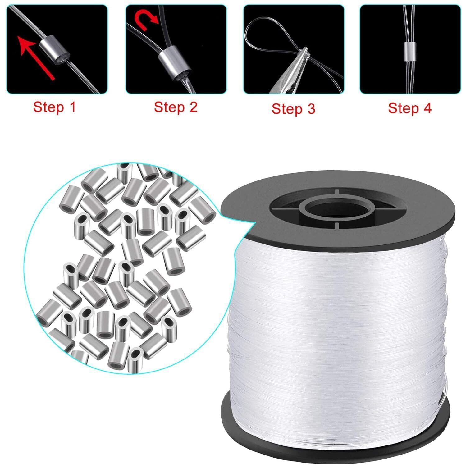 【幅広い用途の吊り下げ金具】➤60個のアルミニウムスリーブが付いた透明なナイロン糸ロールは、フレーム付きのアートワーク、オーナメント、フォトフレーム写真、ストリングライト、プランター、クリスマスの装飾、趣味の縫製、自宅、オフィス、屋外での使用に適しています。高密度ナイロンで長期間使用できます。釣り糸としても使用できます。
