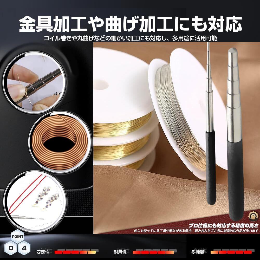- 【2. 高品質な素材と耐久性】巻線棒はステンレス鋼製で、丈夫で壊れにくい設計です。ハンドル部分には滑りにくいゴムカバーが装備されており、快適なグリップを提供します。ジュエリーラインは銅製で、柔軟性と強度を兼ね備えています。