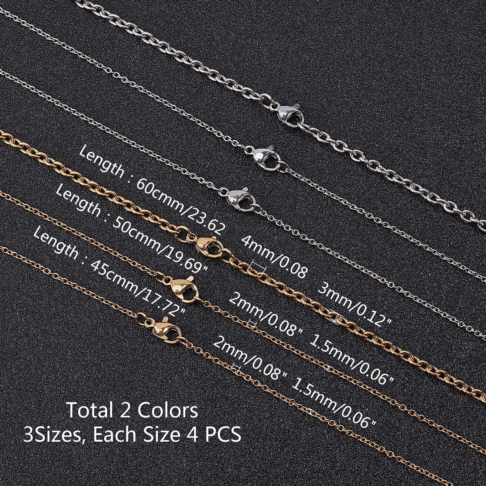 3サイズ:これらのケーブルチェーンのサイズは約45/50/60cmです。、1.5~3mm幅、約2~4x1.5~3x0.3~0.8mmのリンク. 各サイズ4個、合計12枚、ジュエリー作りに十分な量. 彼らはどんな職人にとっても定番のアクセサリーです!