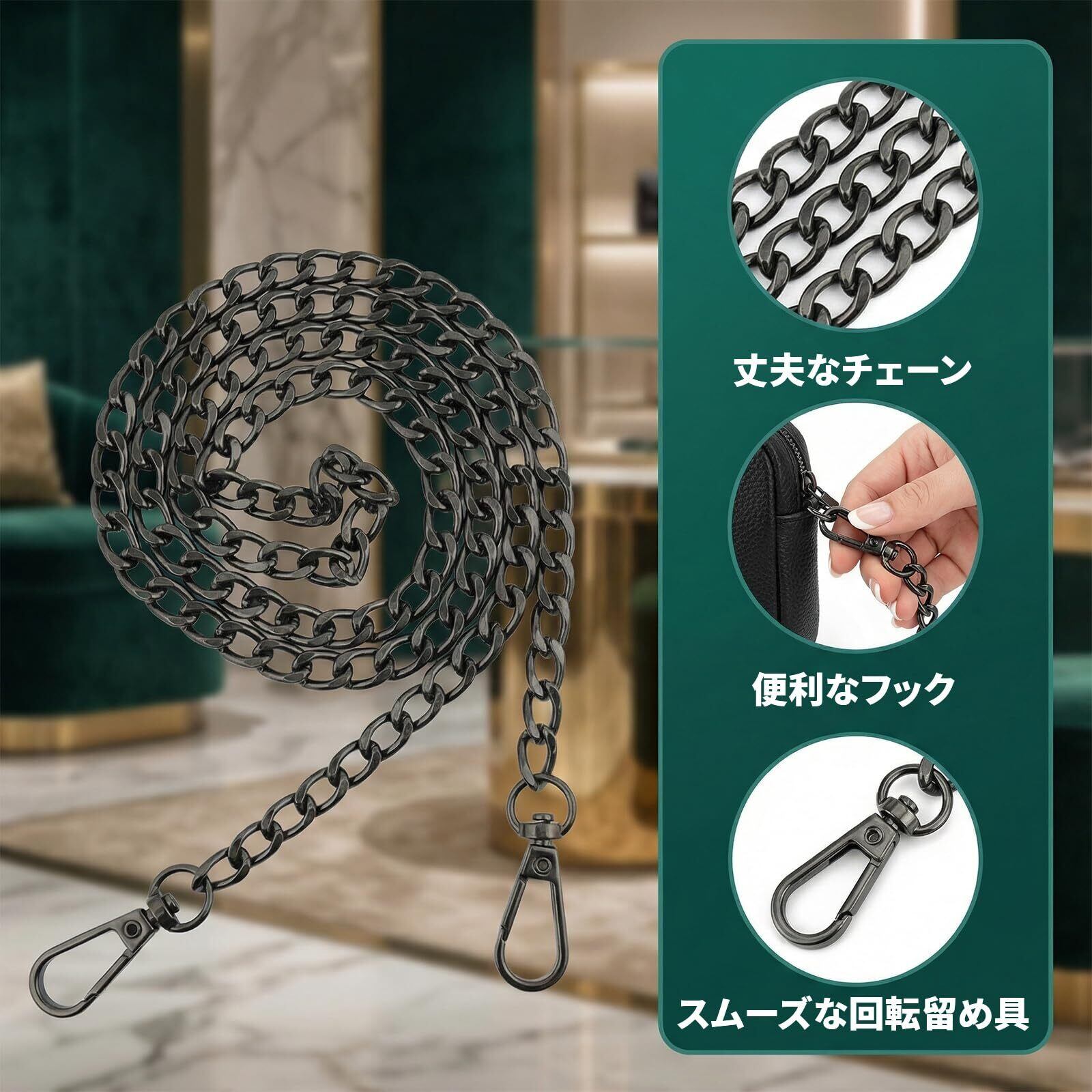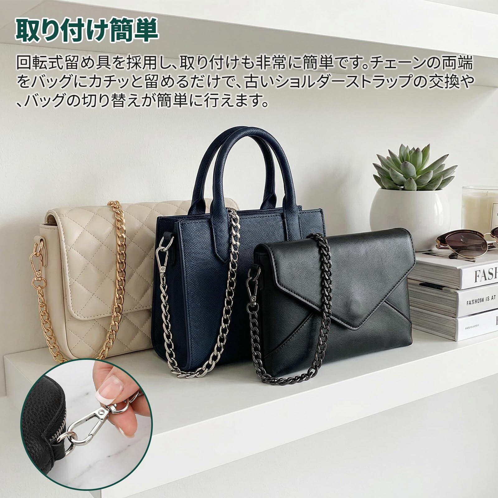 【取り付け簡単】このバッグチェーンは回転式留め具を採用しており、非常に簡単に取り付けられます。チェーンの両端をバッグにカチッと留めるだけで、古いショルダーストラップの交換や、バッグの付け替えが簡単に行えます。