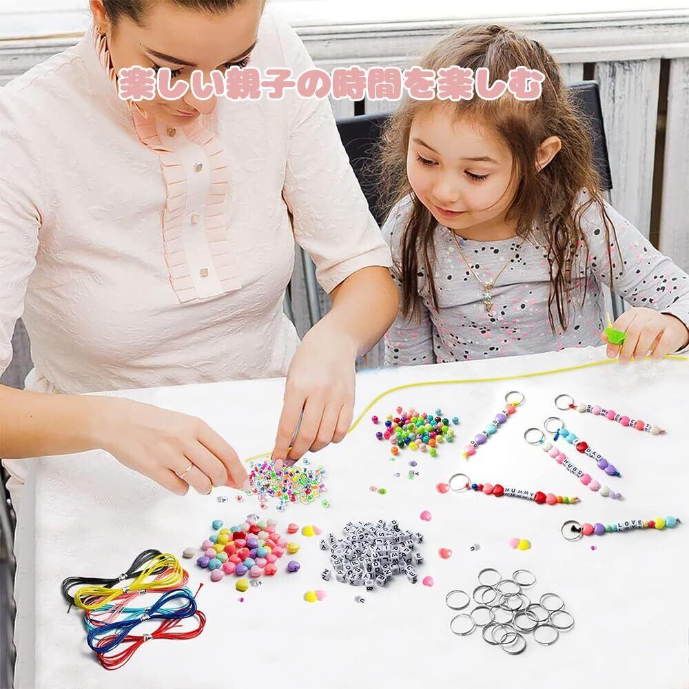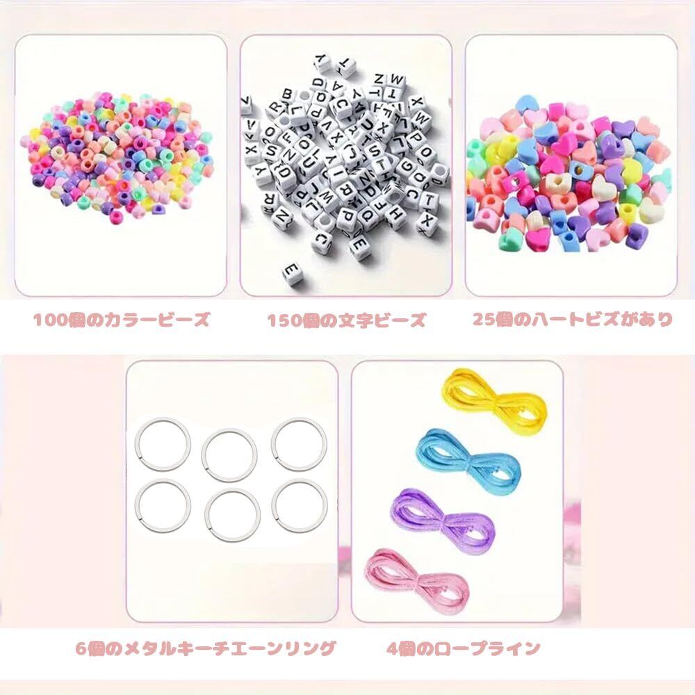 【充実のパッケージ内容】本ビーズキーホルダーキットには、金属製キーリング6個、紐4本、アルファベットビーズ150個、カラフルビーズ100個、ハート型ビーズ25個が同梱。多様なニーズに対応し、キーホルダーやアクセサリー制作において創造性と芸術的自由を発揮し、より面白いアイデアを生み出せます。