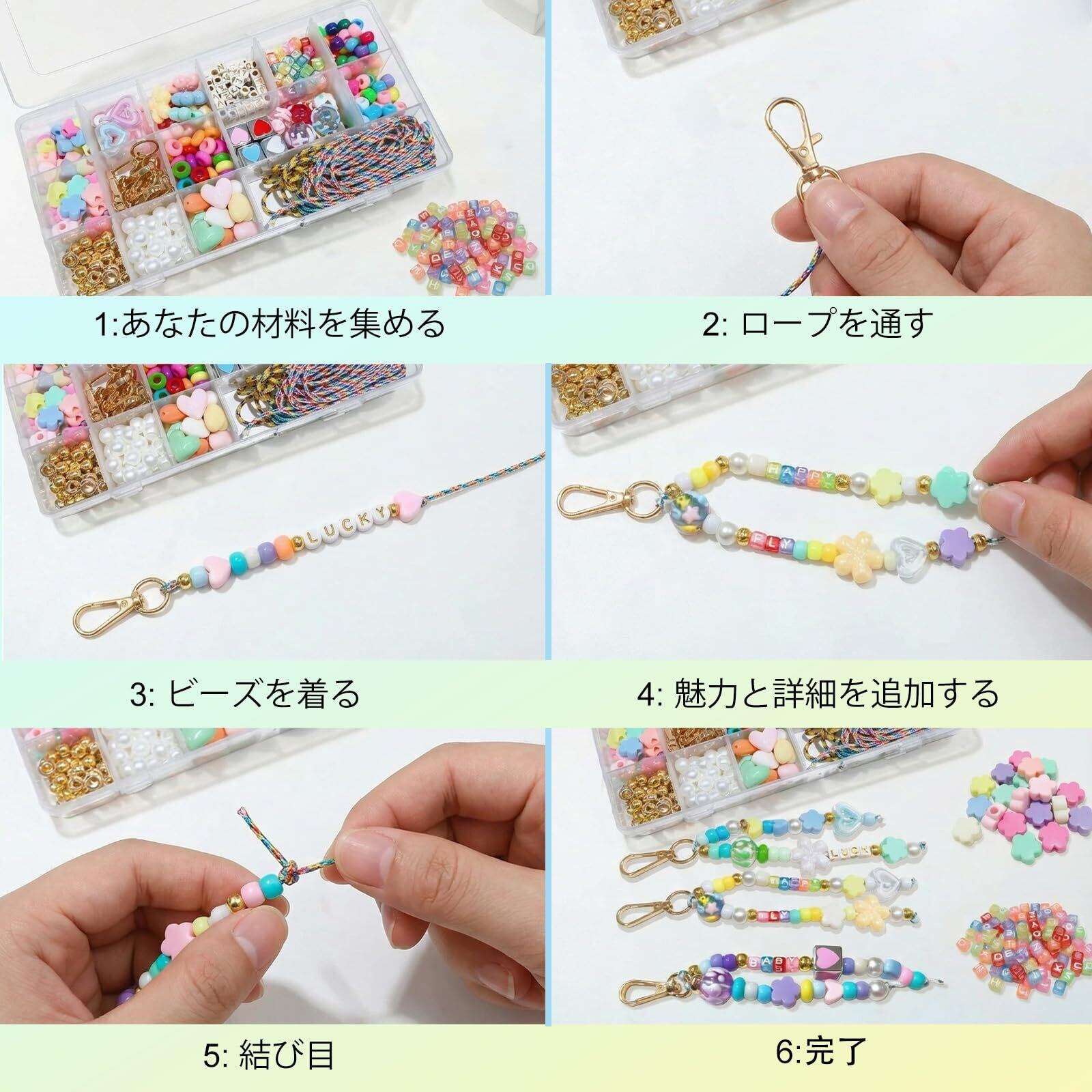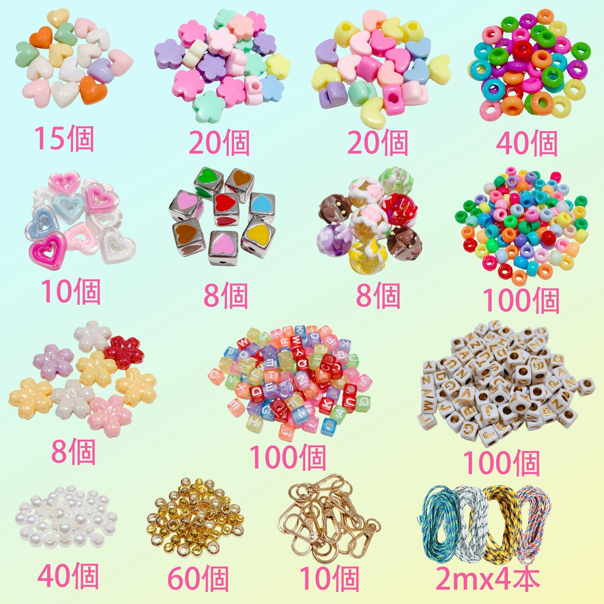 付属コンポーネント メタルキーチェーンリング, 文字ビーズ, カラービーズ, ハートビーズ, 花形ビーズ, 2メートルのロープライン4本, 金属キーリング, プラスチックビーズ, ビーズのキーチェーン