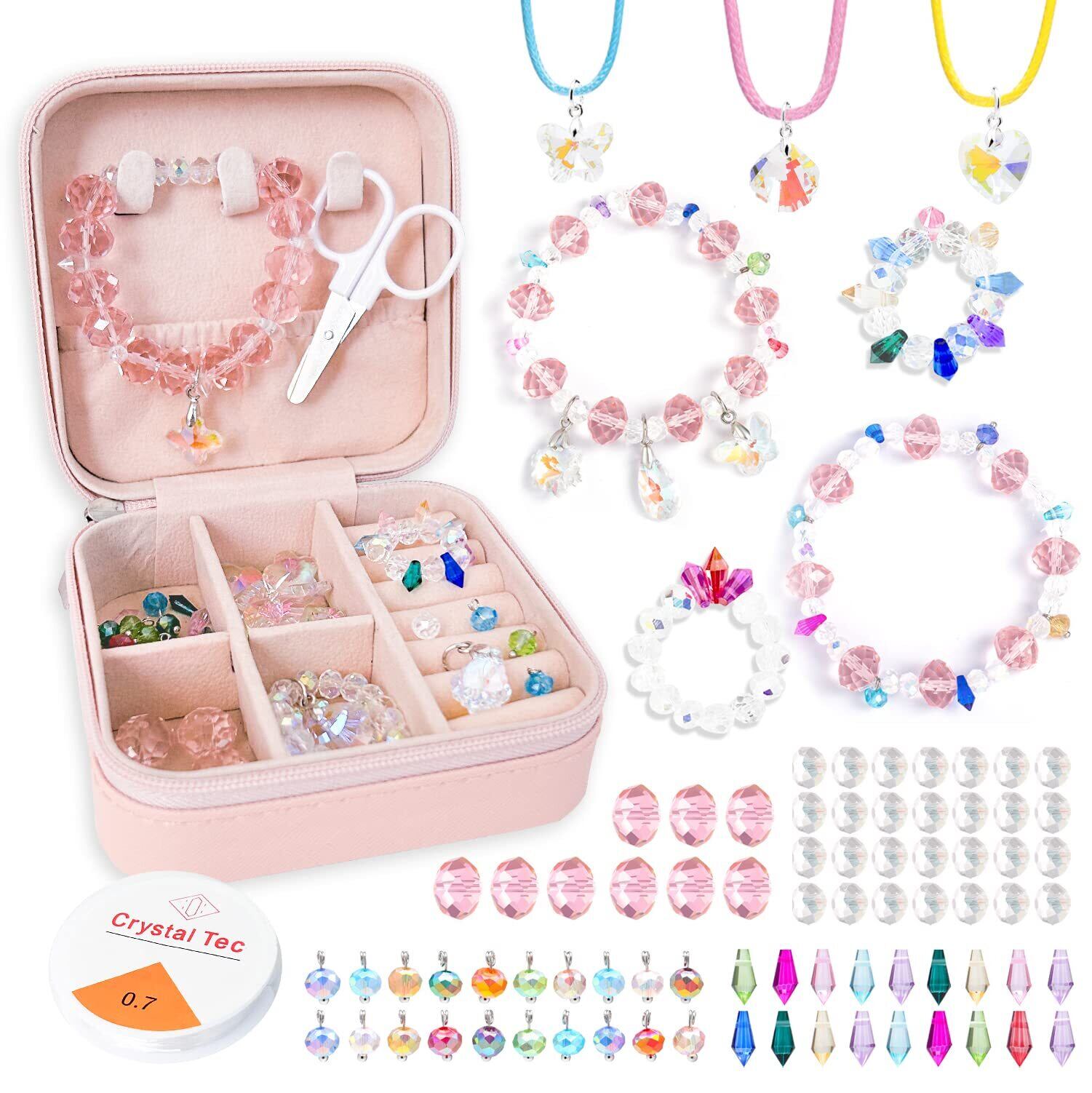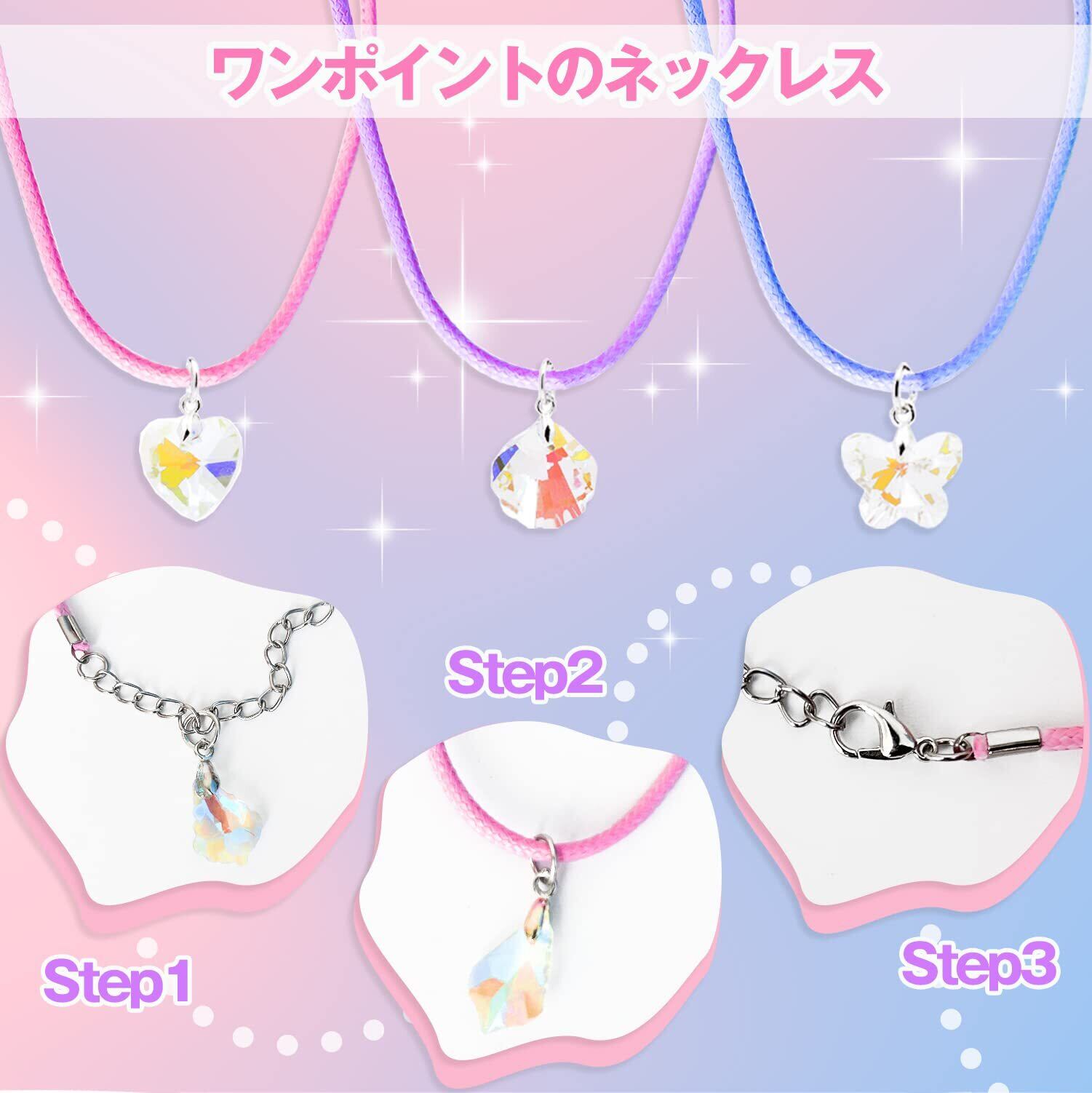 セット内容:カラフルなビーズ・キラキラなチャーム・ネックレス・0.7mmシリコンゴム・ミニハサミ・ジュエリーボックスがついています。細かいビーズがあるので、難易度アップします~物作りが好きな子どもはチャレンジしてみてください!