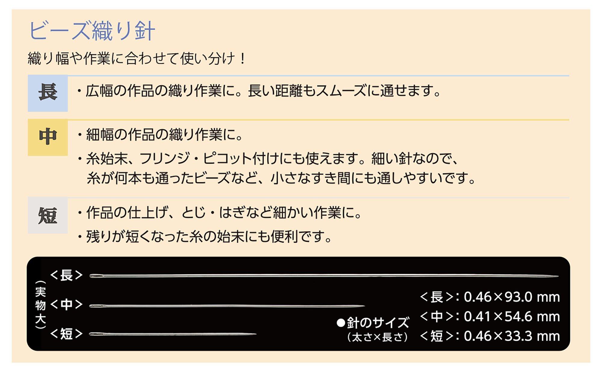 ビーズ織り針の長(2本)・中(2本)・短(1本)の3サイズの取合せになっているので織り幅や作業に合わせて使い分けが可能です。