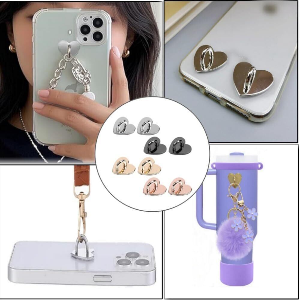 8個 キーリングハンガー パーツ メタル スマホチェーン チェーン パーツ 貼り付け スマホ ケース アクセサリー部品 DIY フック金具 スマホケース用、ハート型 (ゴールド シルバー ブラック ピンク)
