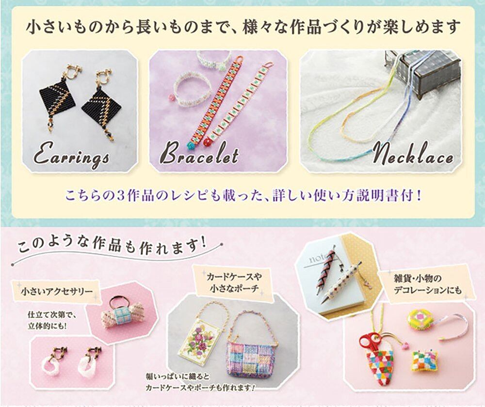 【素材】【ビーズ織り機】 、フレーム・ピン:ABS樹脂 、糸かけ棒・巻き取り棒:ポリアセタール 、ノブ・レール:ポリカーボネート 、ボルト・ナット:鉄 、ネジ:(持ち手)ポリアミド、(ネジ部)鉄 、 、【ホルダー】ポリアセタール 、【ストッパー】ステンレス 、【針】鋼(ニッケルメッキ) 、【針ケース】オレフィン系樹脂 、【スレダー】(持ち手)アルミニウム、(線材)ステンレス