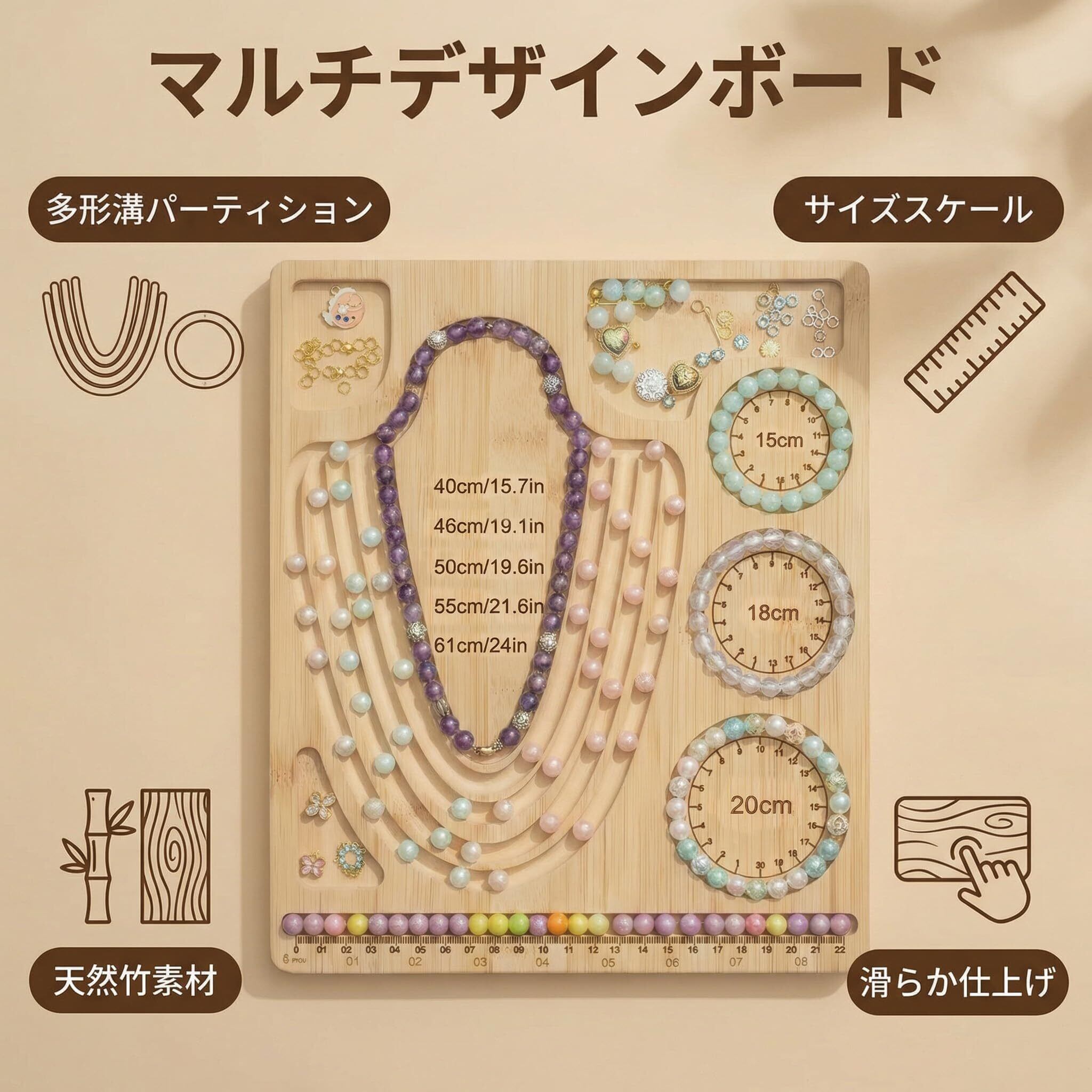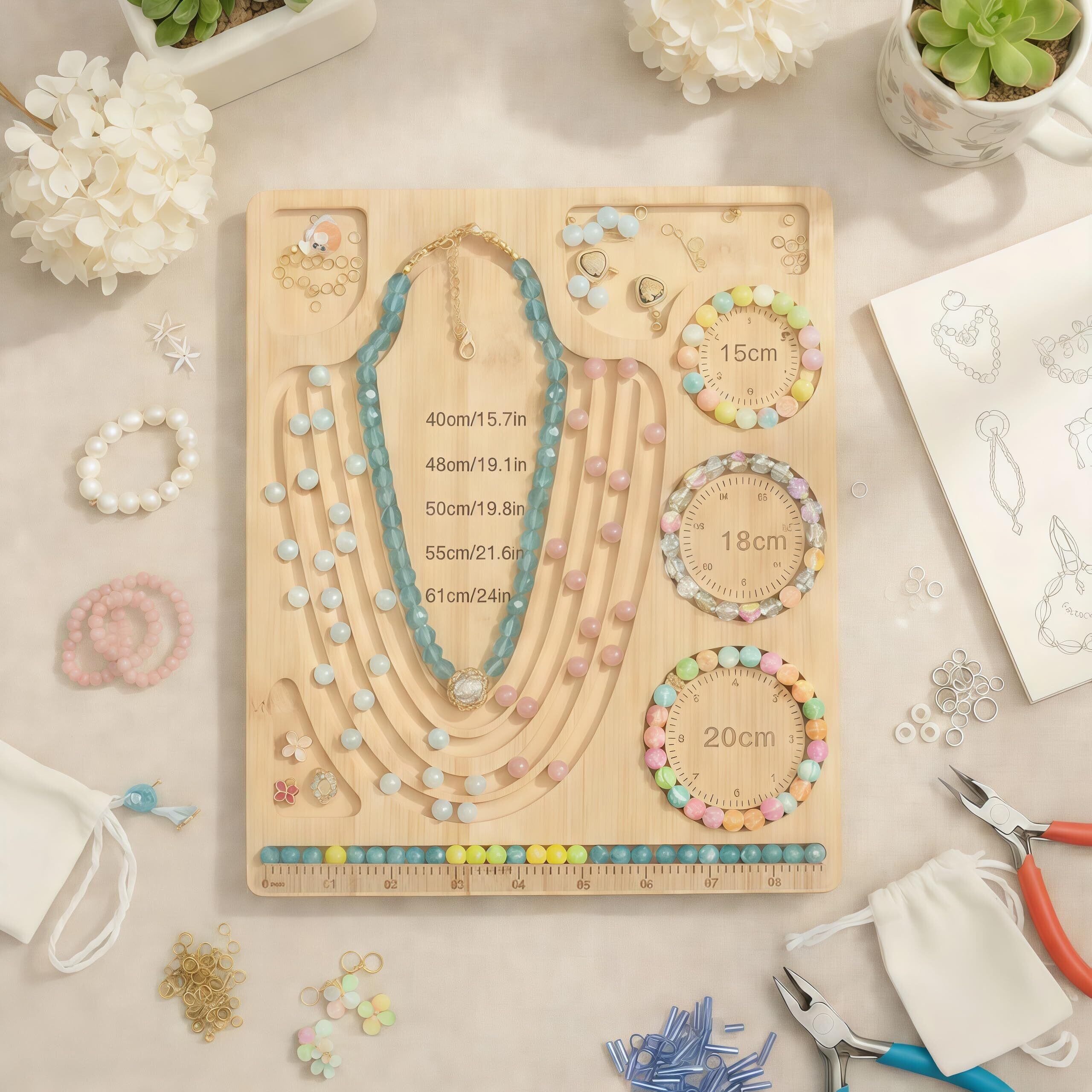 寸法:このデザインボードの寸法は28*24*1cm。このビーズボードには長さ40〜60cmまでのネックレスのための5つのネネネックレスがあります(約40/46/50/55/61cm)。3つの異なるサイズの直径(15/18/20cm)3種類の手首サイズに対応して作成することができます。ボーダーには直線チャンネルと定規があり。このボード上のスケールと穴の組み合わせにより、デザイナーは創造的なアイデアに従って簡単にビーズを張ることができます。