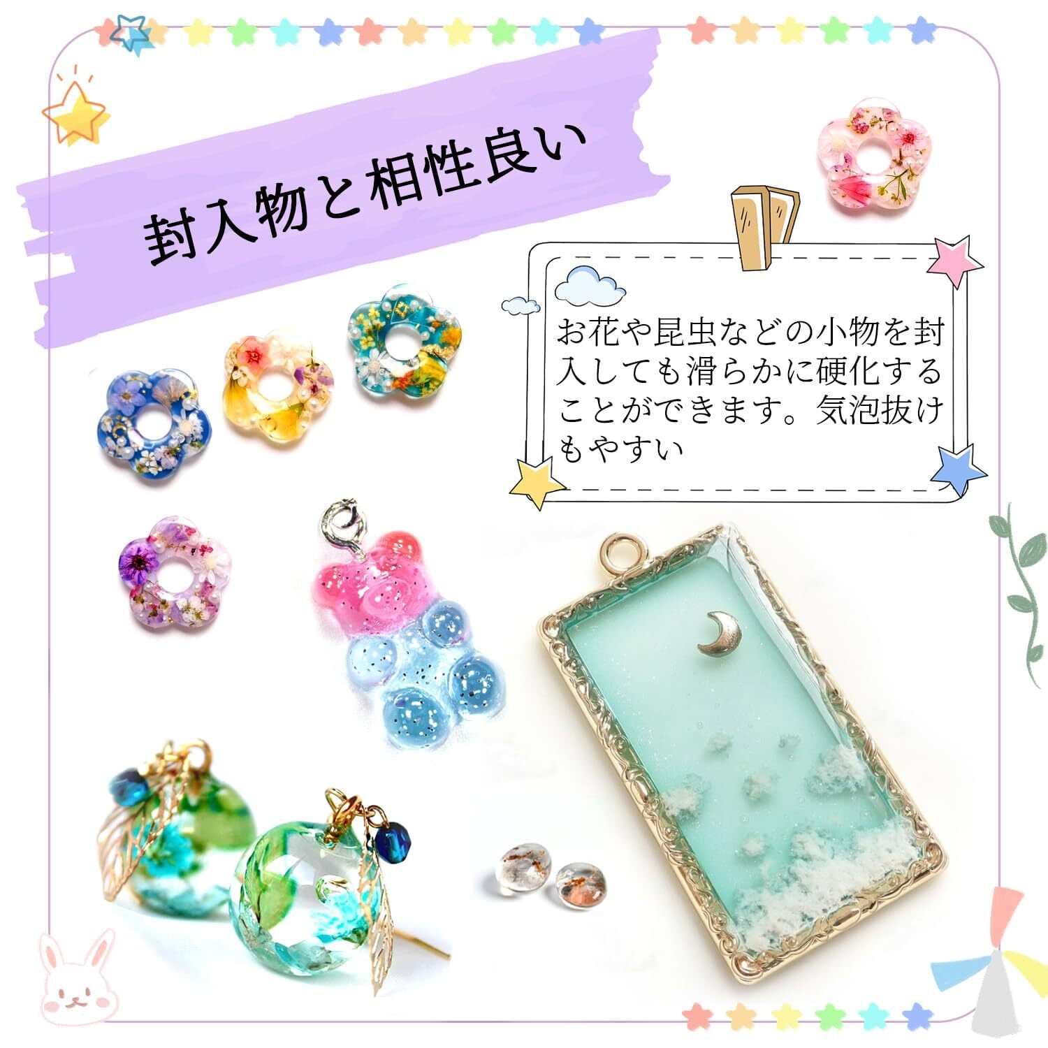 【納得の透明感】ドライフラワーや昆虫などの封入素材を入れてもはっきりと見えますさらっとした粘度でモールドの細い部分にレジンを流し込みやすいし気泡抜けもやすい着色剤とも混ざりやすく発色がきれいです自分好みの色を作りたい場合は手軽に着色料を混ぜて作りまょう