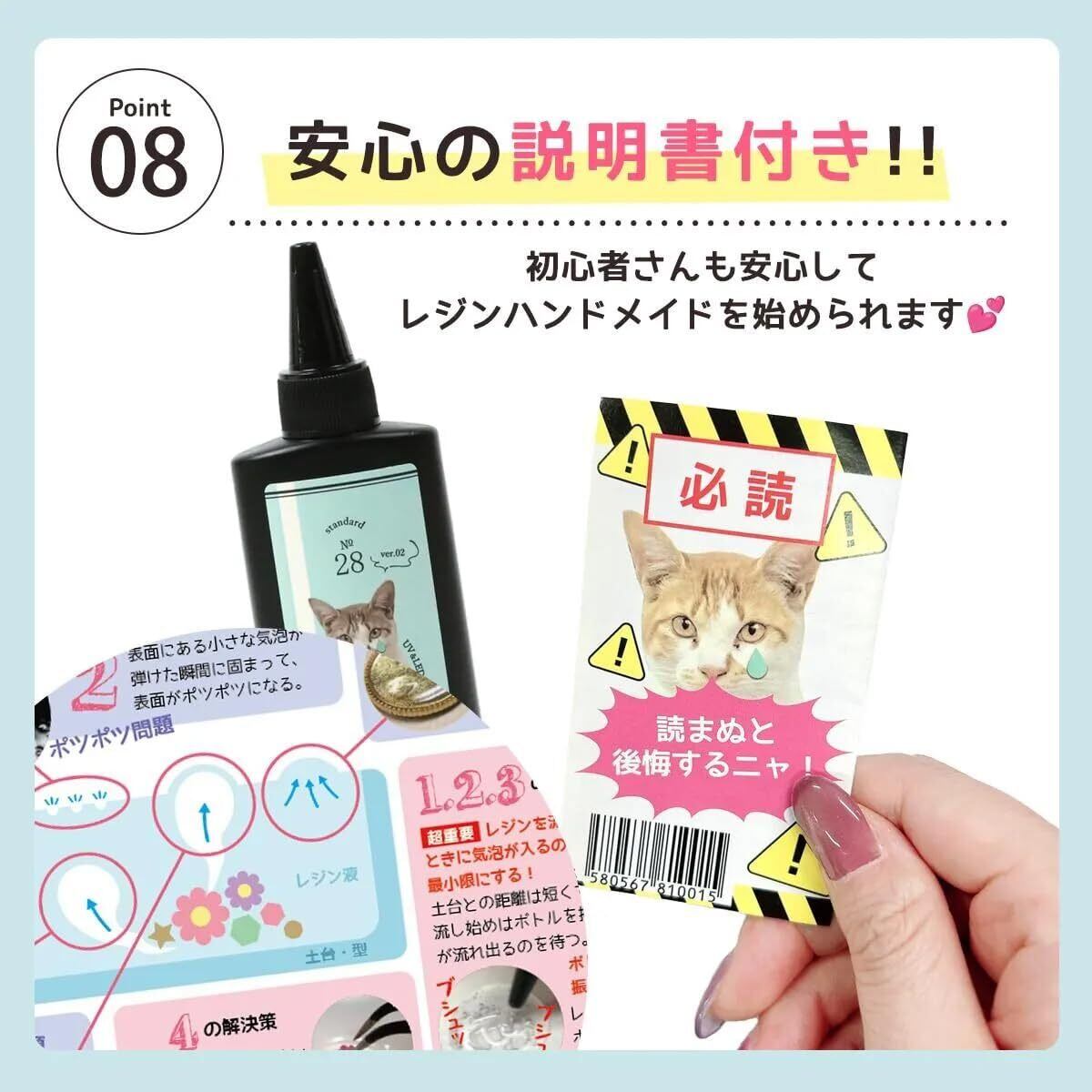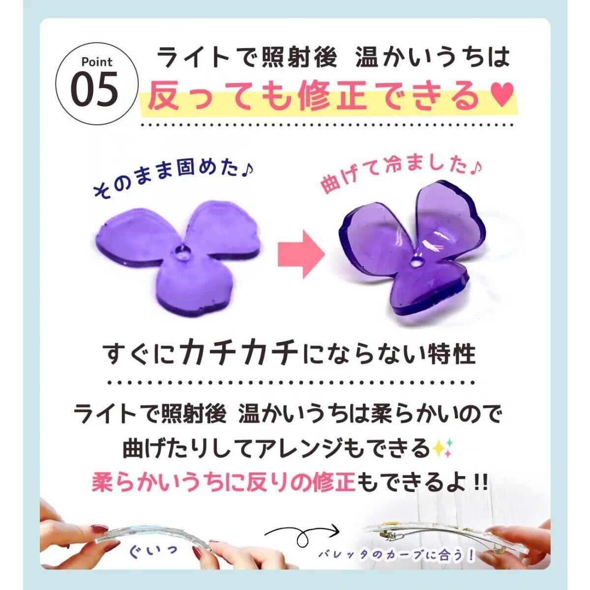 【特徴】 ・UVライトもLEDライトも両方対応 ・着色剤との相性が非常に良い ・モールドにも対応し、硬化後の型からの取り外しがスムーズでシリコン型が痛みにくい ・刺激臭が少ない