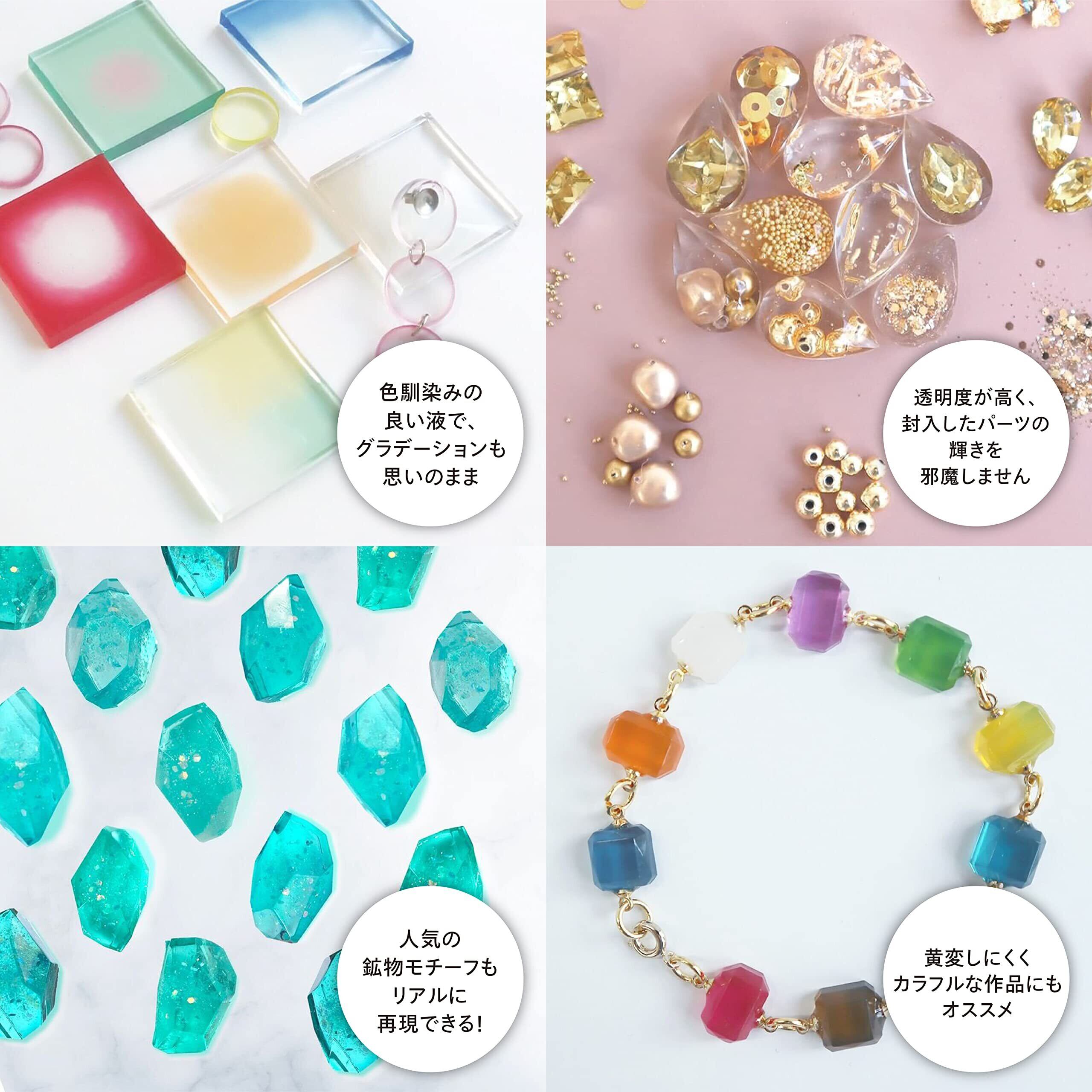 ご注意2:作品制作前にレジン液を別容器に入れて、アルミ箔など遮光ができるものを被せて数時間置いておくと細かい気泡が表面に上がってきます。 数時間放置するかエンボスヒーター(別売り/品番:EHT)で気泡を取り除いてからご使用いただきますと、気泡の無いきれいな作品が制作できます。 ご注意3:硬化直後は若干弾性が見られる場合がありますが、時間が経つとハードな仕上がりになります。