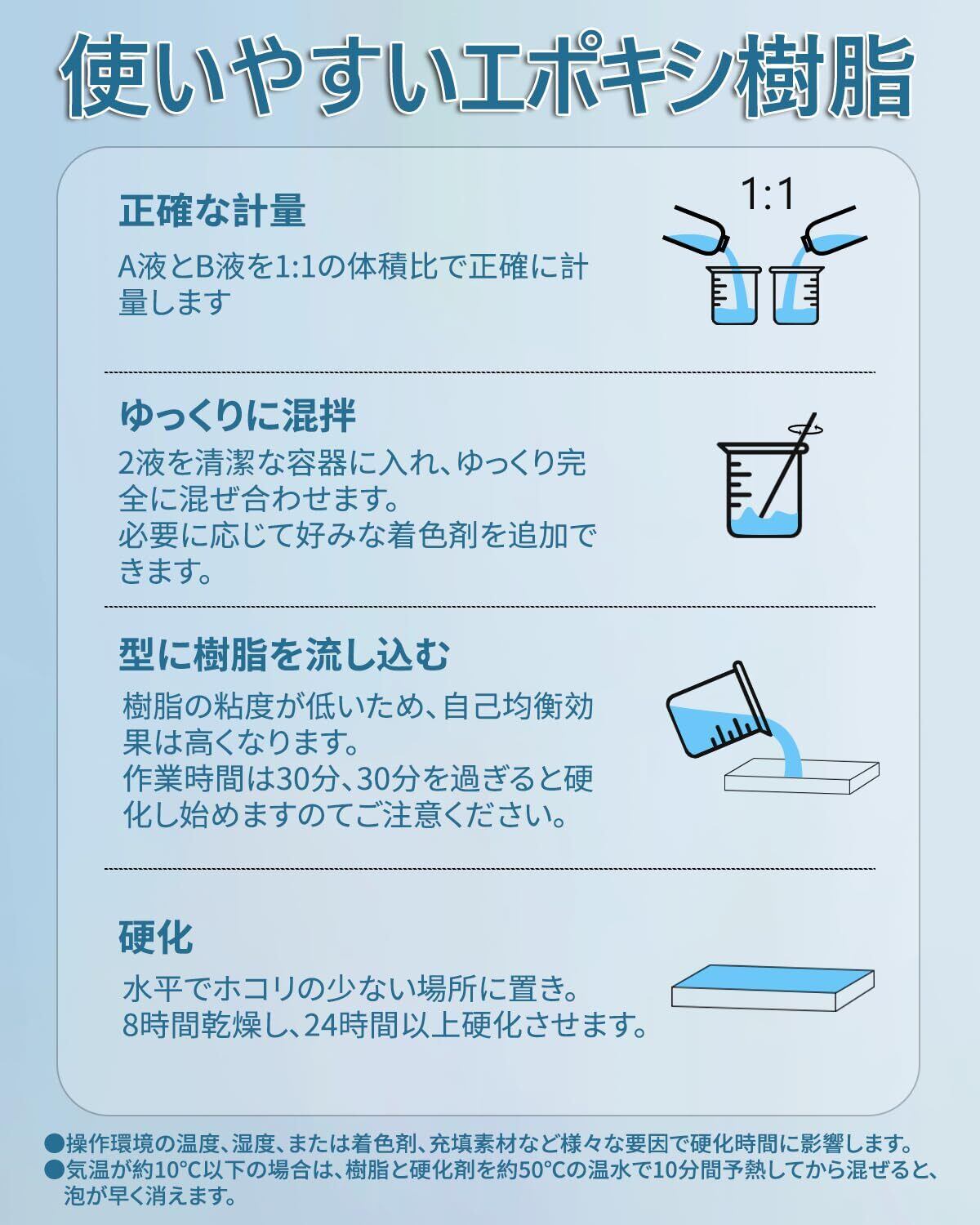 【取り扱い上の注意事項】A液とB液を1:1の体積比でしっかりと混ぜる必要があります。混合後、気泡がなくなるまでよくかき混ぜてください。硬化について、室温22-29℃の室内で通気の良い場所に置き、紫外線を避けることがおすすめです。