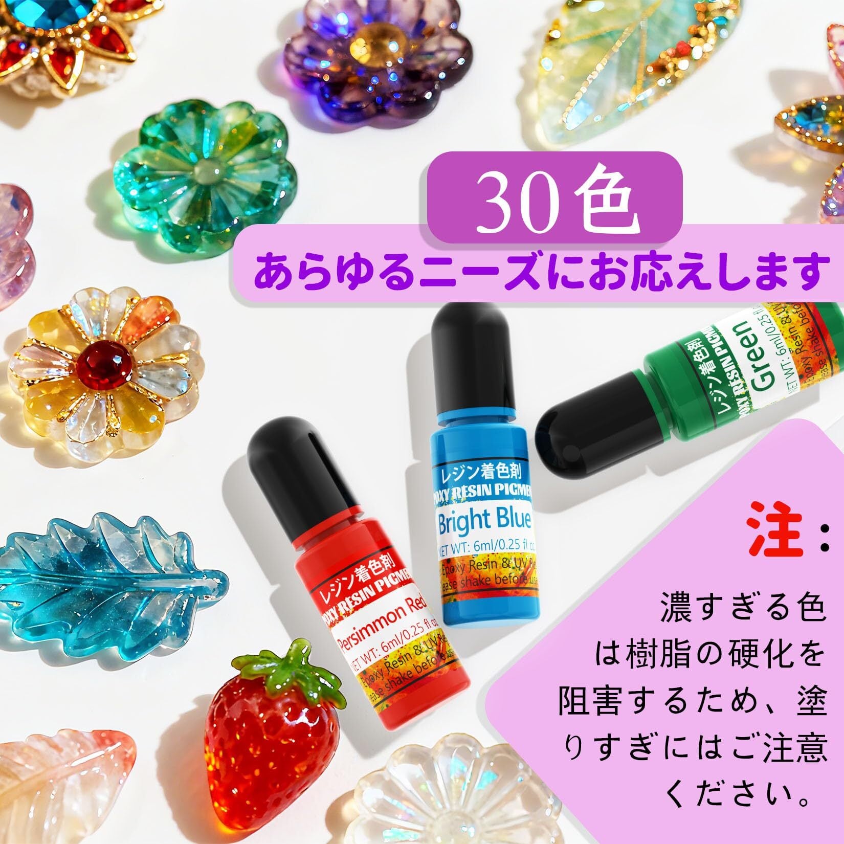 【人気の30色を豊富に取り揃え】日々の創作活動のニーズに応える、厳選された30色をご用意しました。当社のレジン 着色剤は、エポキシレジンやUVレジンに最適です。宝石のような鮮やかで透明感のある色を表現でき、レジン モールドやシリコンモールドに最適です。