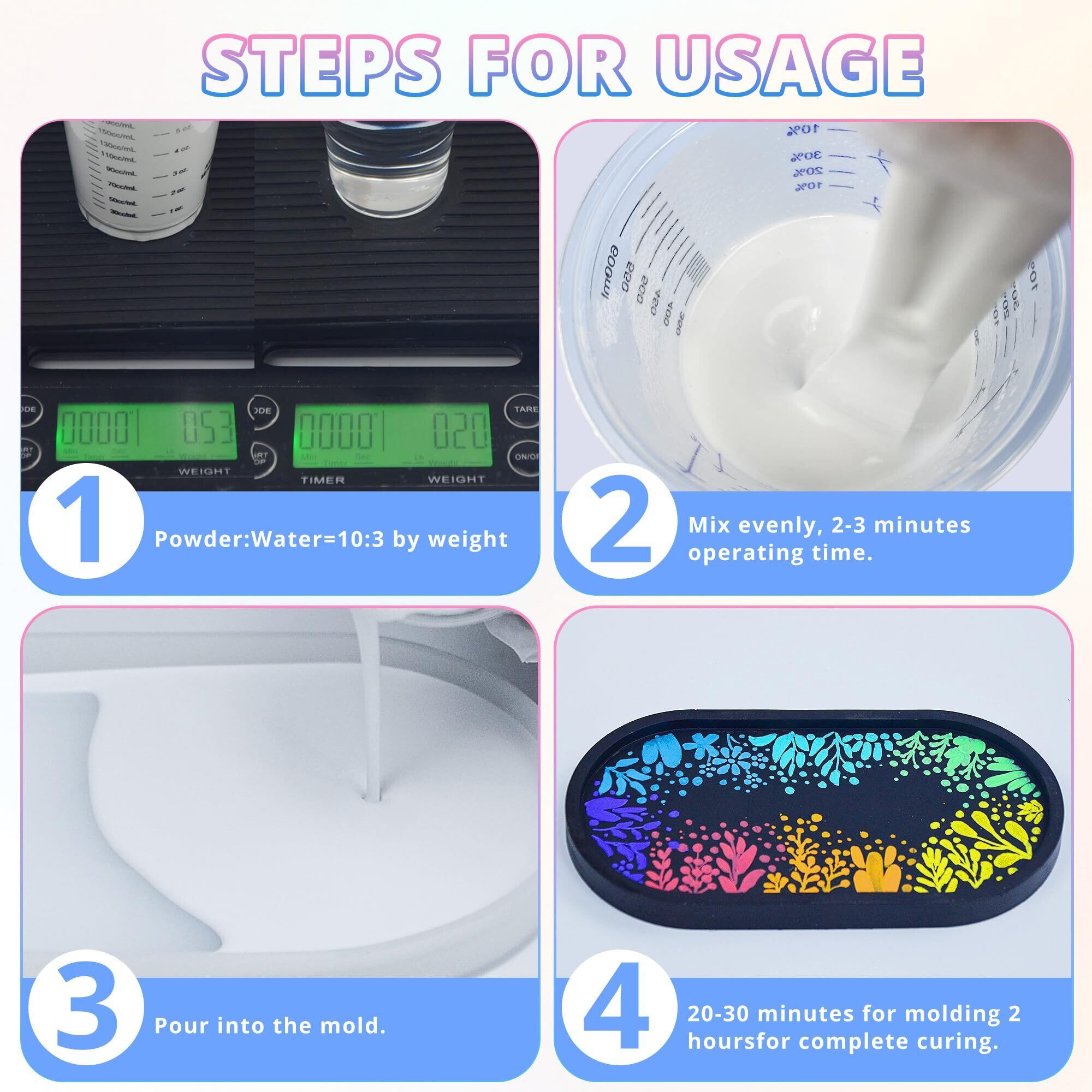 【簡単操作・初心者向け設計】粉と水を正確に計量し、混ぜるだけのシンプルな工程!理想的な混合比率は粉末:水=3:1(重量比)で、必要に応じて水の量を調整可能です。2分間しっかりと混ぜたら型に流し込み、固まるまで待ちましょう。誰でも簡単にプロのような仕上がりが楽しめます。