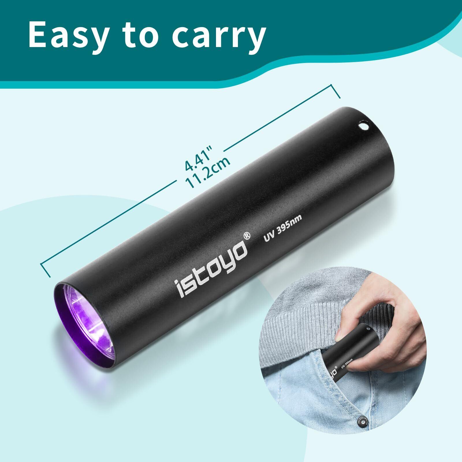 強力な395 nmUVライト:懐中電灯は395 nm波長の紫外線を提供し、アップグレードされたビーズLEDを搭載している。光反応効率が高く、表面硬化に特化している。そのサイズは11.2*2 cm/4.4*0.78 INで、ポケットに入れて、隠れた汚れを検出するために持ち歩くことができるほど小さい。