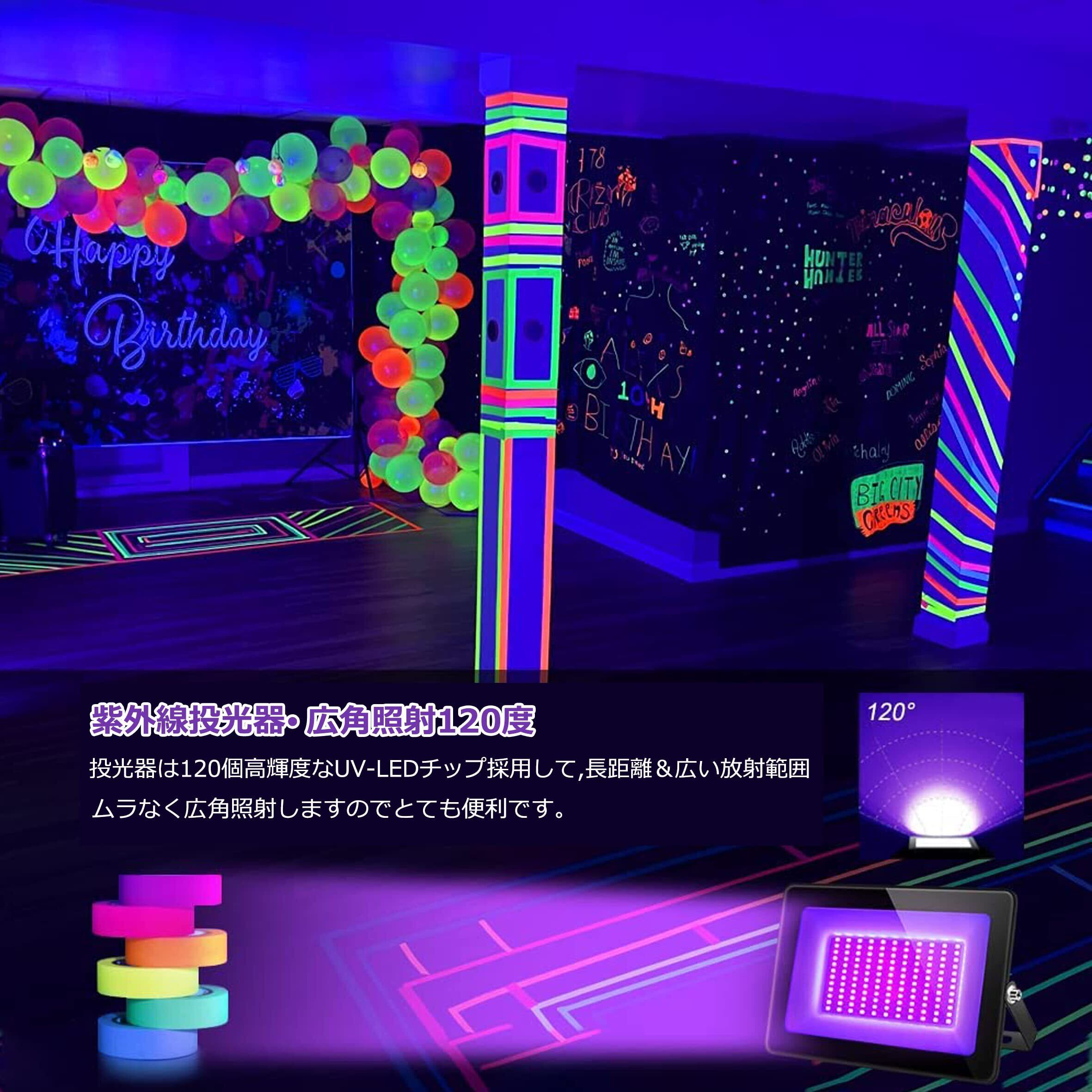 【紫外線投光器、高輝度】:高品質LED光源を採用して、蛍光剤を含んだ物質に当てると、美しい光を発して浮き上がり、夢幻の雰囲気を演出することができます。パネルシアター、舞台演出、舞台・看板の蛍光照明などで活用されています。