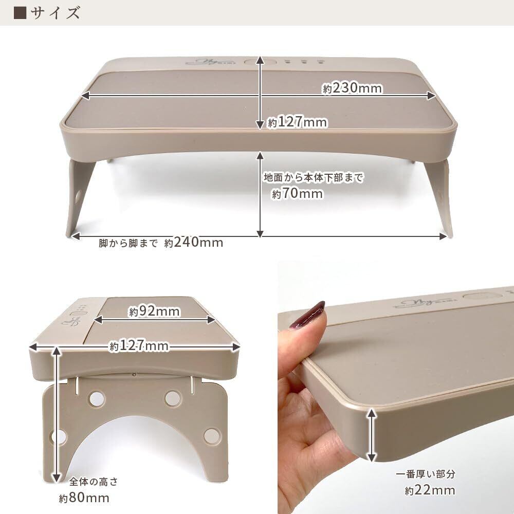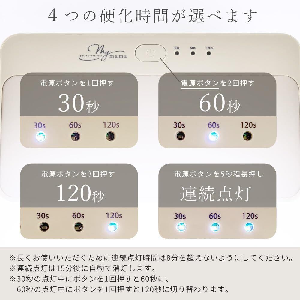 耐荷重は約500gです。それ以上の重量のものを乗せたり上から強い力をかけたりしないで下さい。破損の原因となります。ジェルネイルでライトを直接手に当ててご使用のする際、熱さなど 異常を感じたら使用を中止してください。やけど、皮膚に炎症を起こす恐れがあります。連続点灯機能は安全のため15分で自動消灯しますが、長くお使いいただくために8分を超えないようにしてください。※その他、付属の取り扱い説明書をご使用前にご一読いただきますようお願い申し上げます。