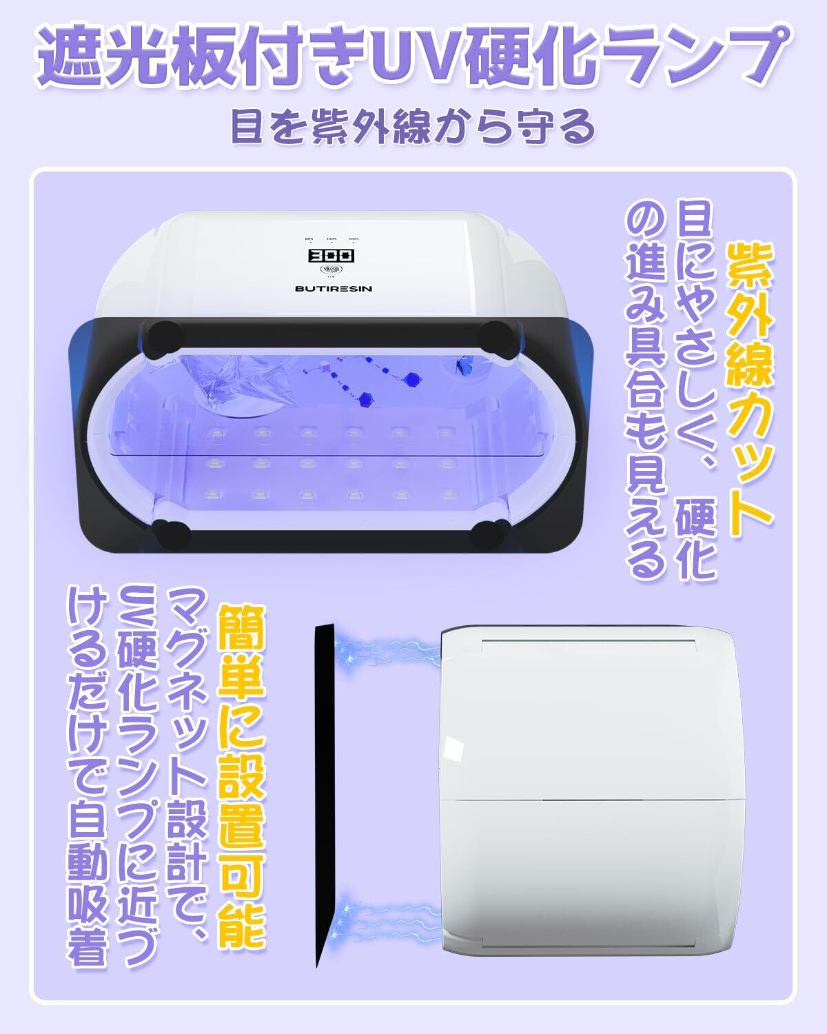 【折りたたみ式&磁気吸着のUV遮光板】本体は折りたたみ式で、コンパクトに収納でき持ち運びも簡単。さらにUV遮光板は磁気吸着設計のため、近づけるだけで自動的に固定。工具不要で素早くセットでき、紫外線をしっかり遮光しながら作品の硬化状態を安全に確認できます。