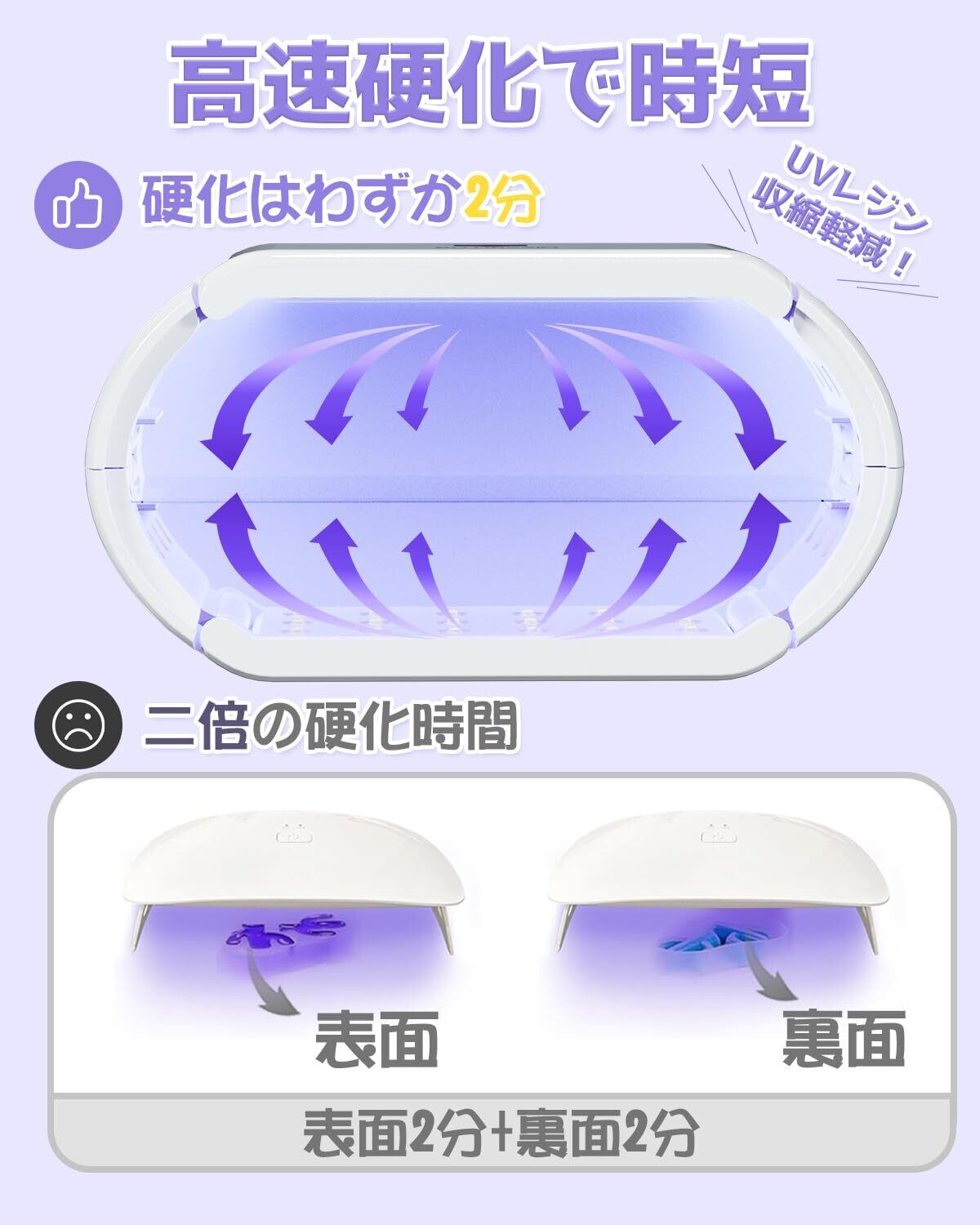 【上下両面照射&48W高出力】48Wの高出力と48個の高性能LEDを搭載し、上下からの360°両面照射を実現。樹脂内部まで均一かつ強力に光を届けることで、従来型ランプと比べて硬化速度・仕上がり精度の両方を大幅に向上させます。厚みのあるレジン作品でもムラなくスピーディーに硬化可能。