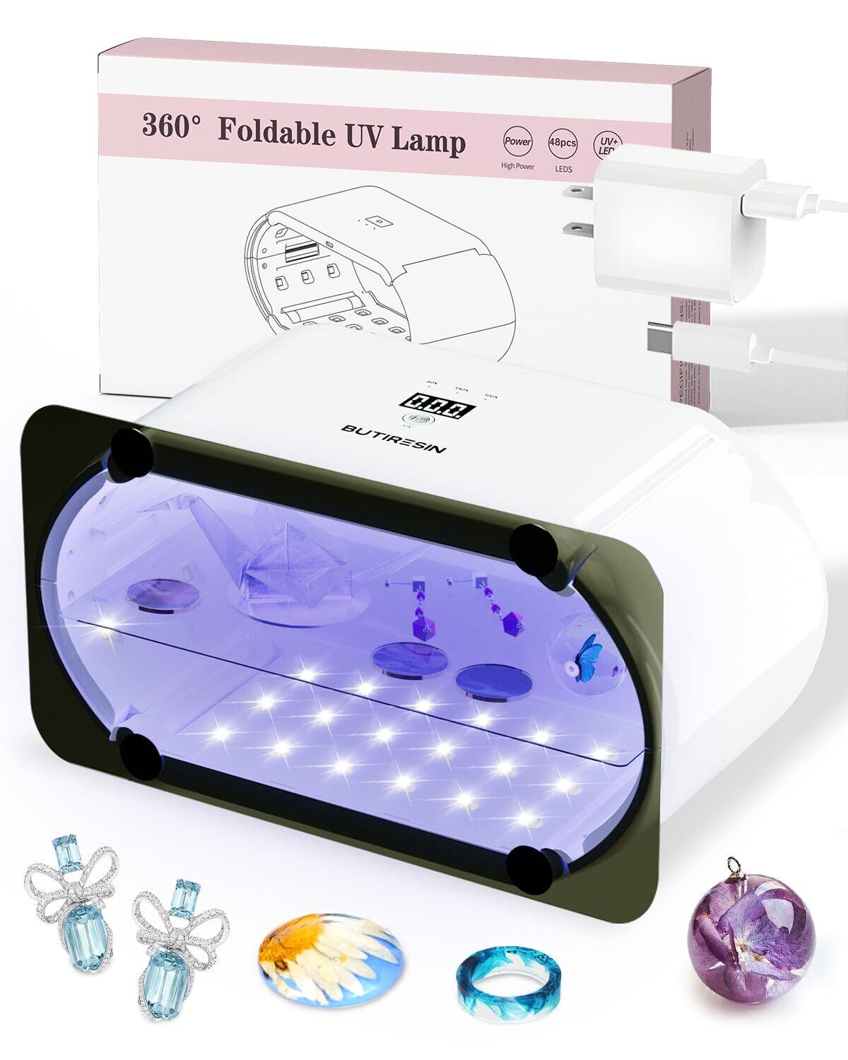 UVライト レジン用 48W 両面照射 360度光源 48個LED搭載 4段階時間調節 (60秒・180秒・300秒・600秒) UV遮光板付き 折りたたみ式 コンセント直差し式 2-IN-1 レジン硬化用 多用途DIY対応
