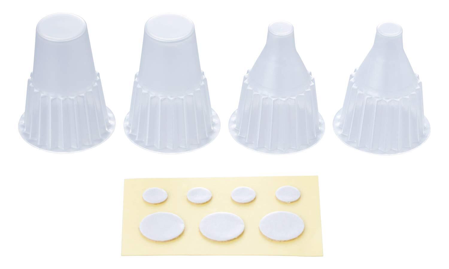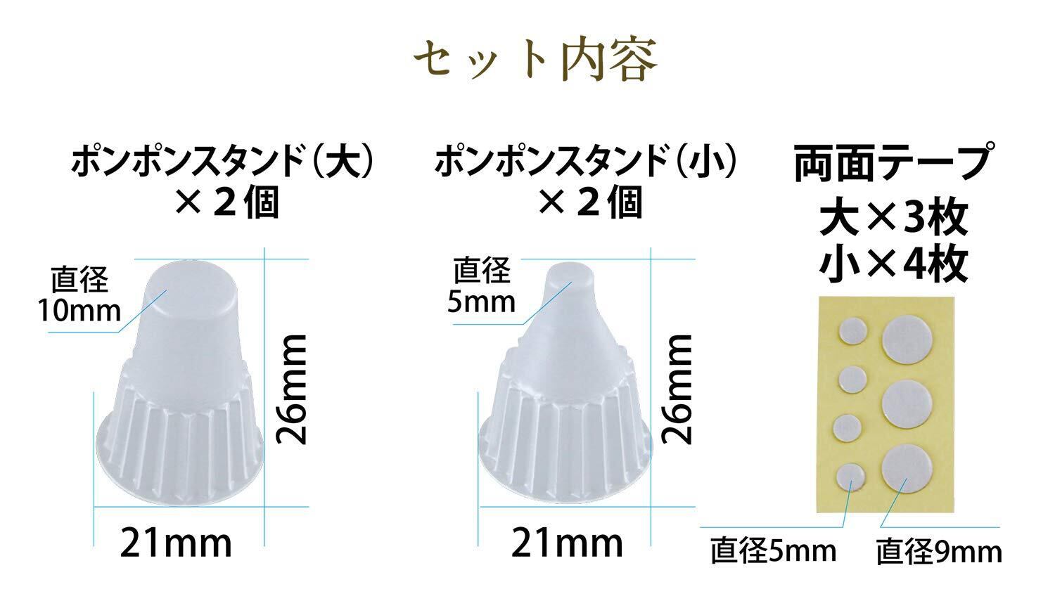 本体サイズ:φ21×H26mm/内容物:スタンド(小・5mm台)×2、スタンド(大・10mm台)×2、両面テープ(小×4、大×3)、取扱説明書