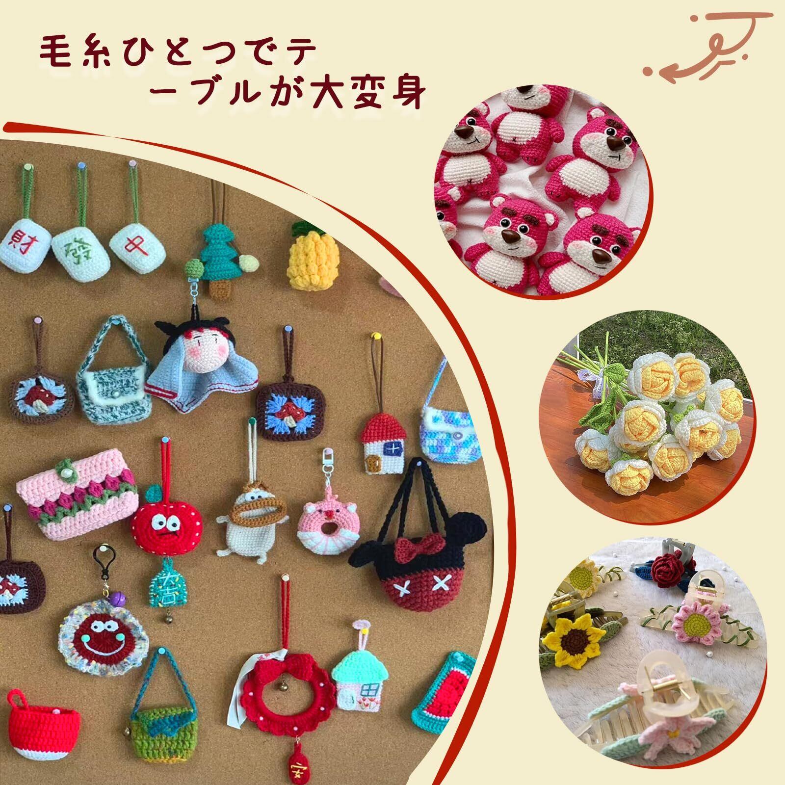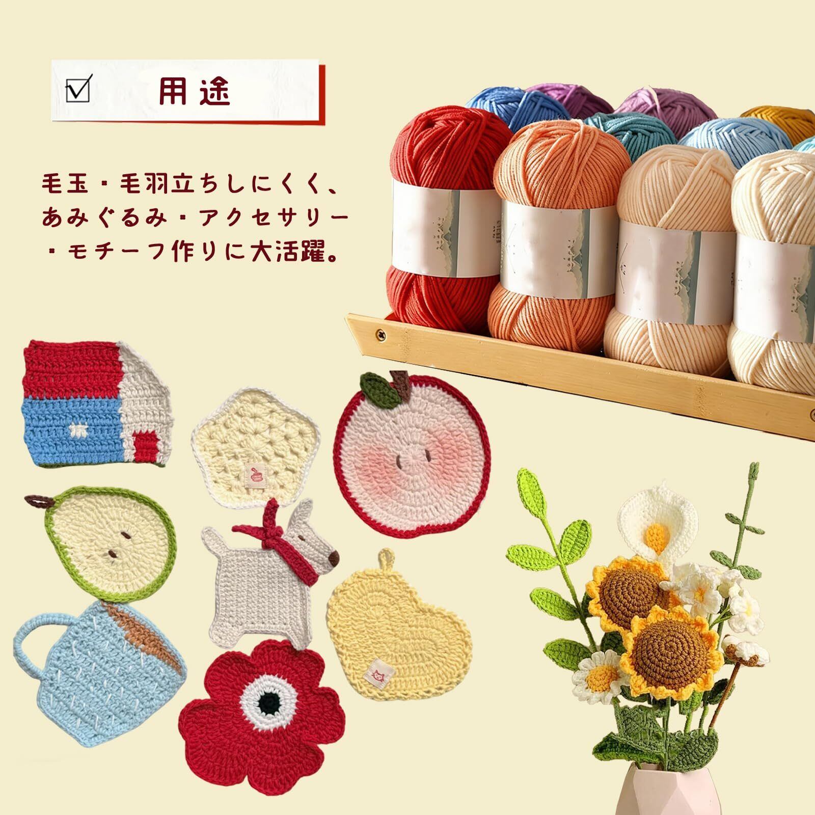 用途:毛玉が出にくい、毛羽立ちしにくい素材です。モチーフ、アクセサリー、あみぐるみ、ポーチ、などの小物の編み物に最適です。