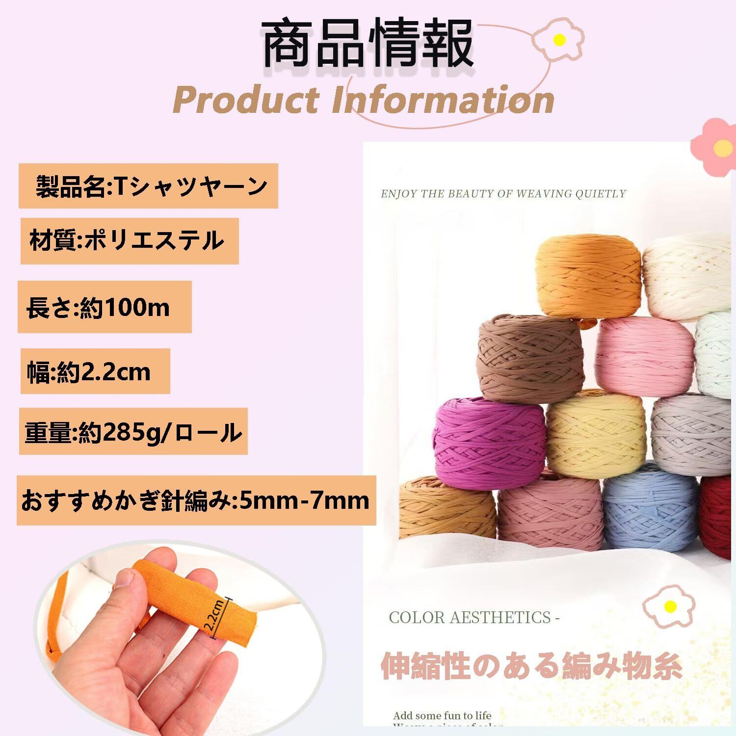 【1玉あたりの寸法】: 重さ:約285g/ロール、長さ:約100m。幅:約2.2cm。5mm-7mmかぎ針用。十分な長さのTシャツヤーンを1玉お渡しします。