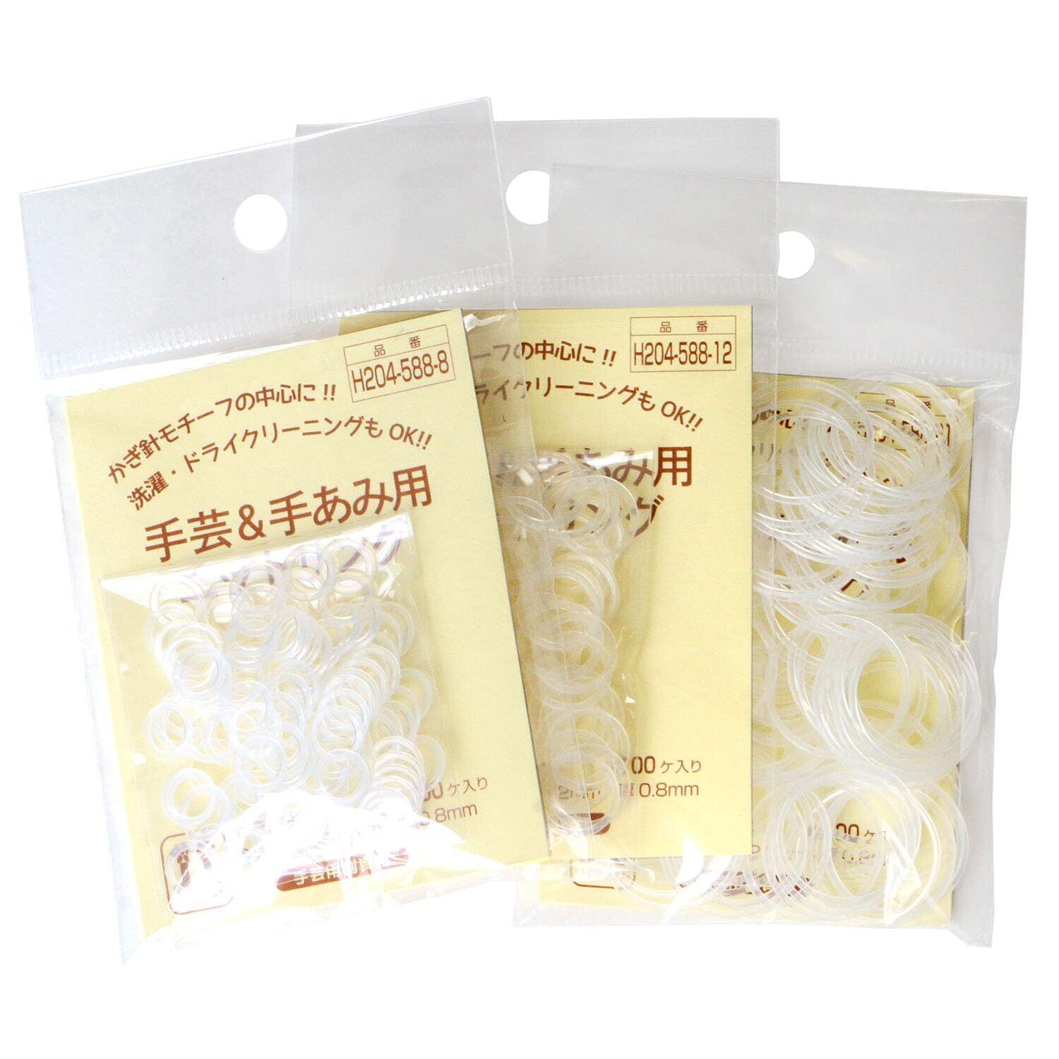 かぎ針モチーフの中心に芯として使用します。洗濯、ドライクリーニングもOKで、被せ編みをするリングです。サイズ:外径8mm厚さ0.8mm内容:100個入り素材:ポリエチレン製。