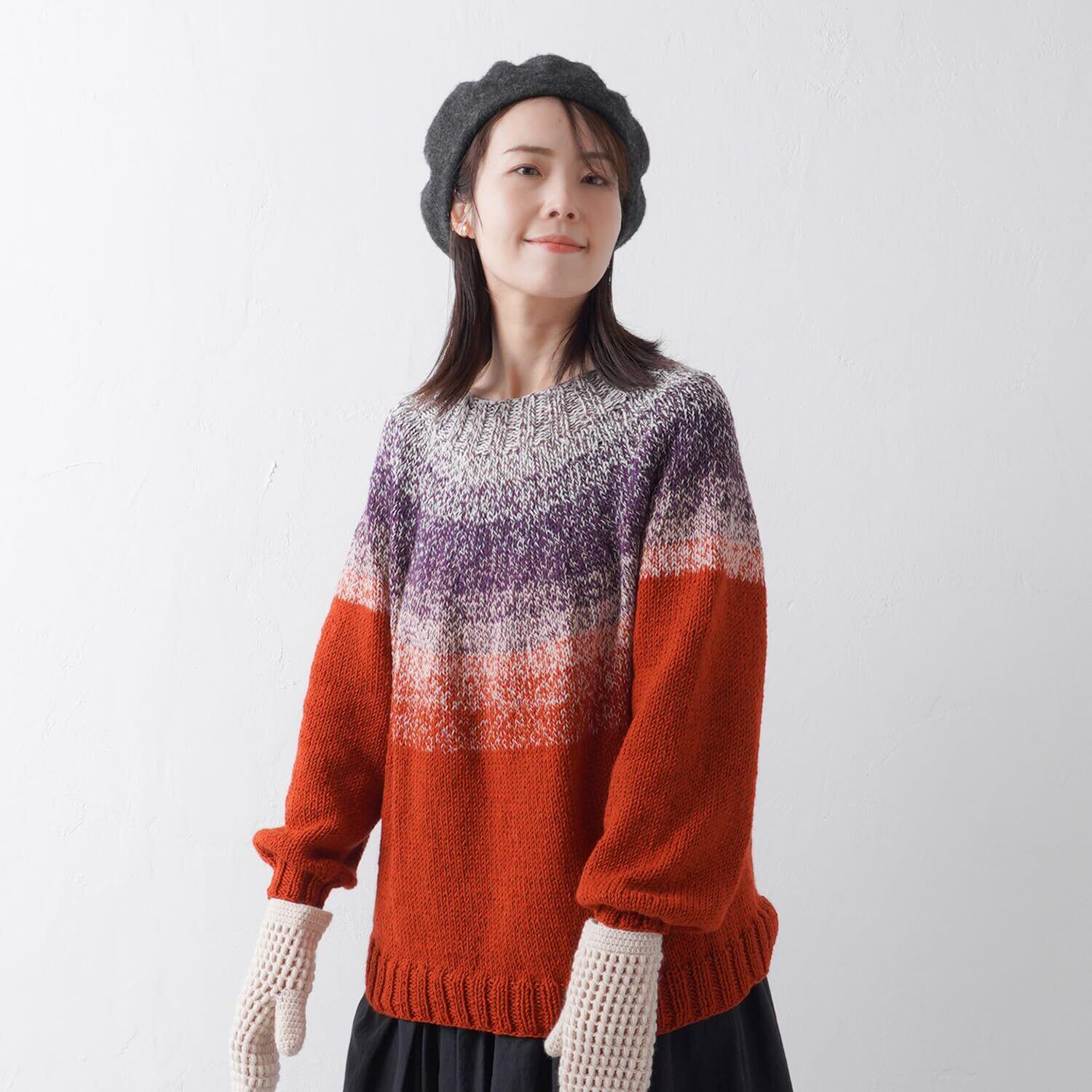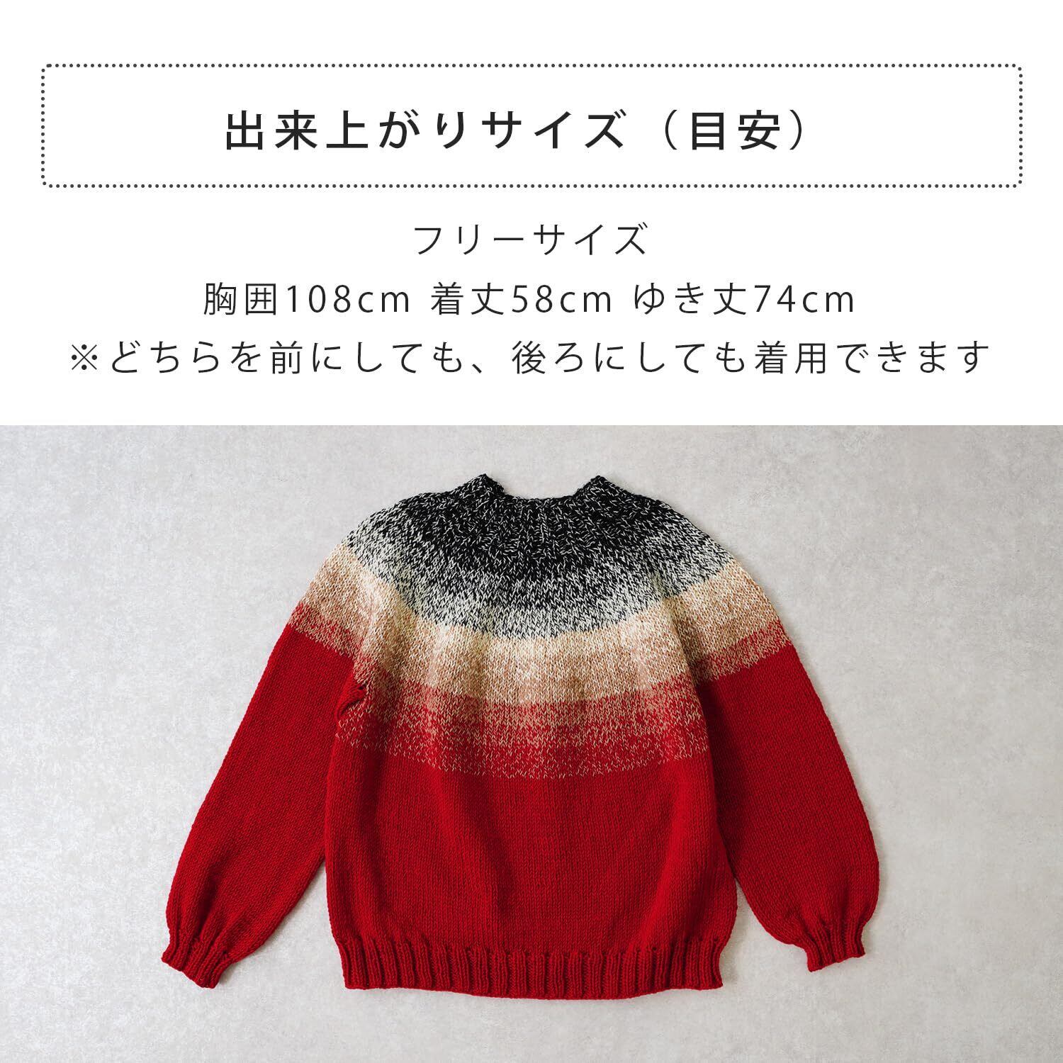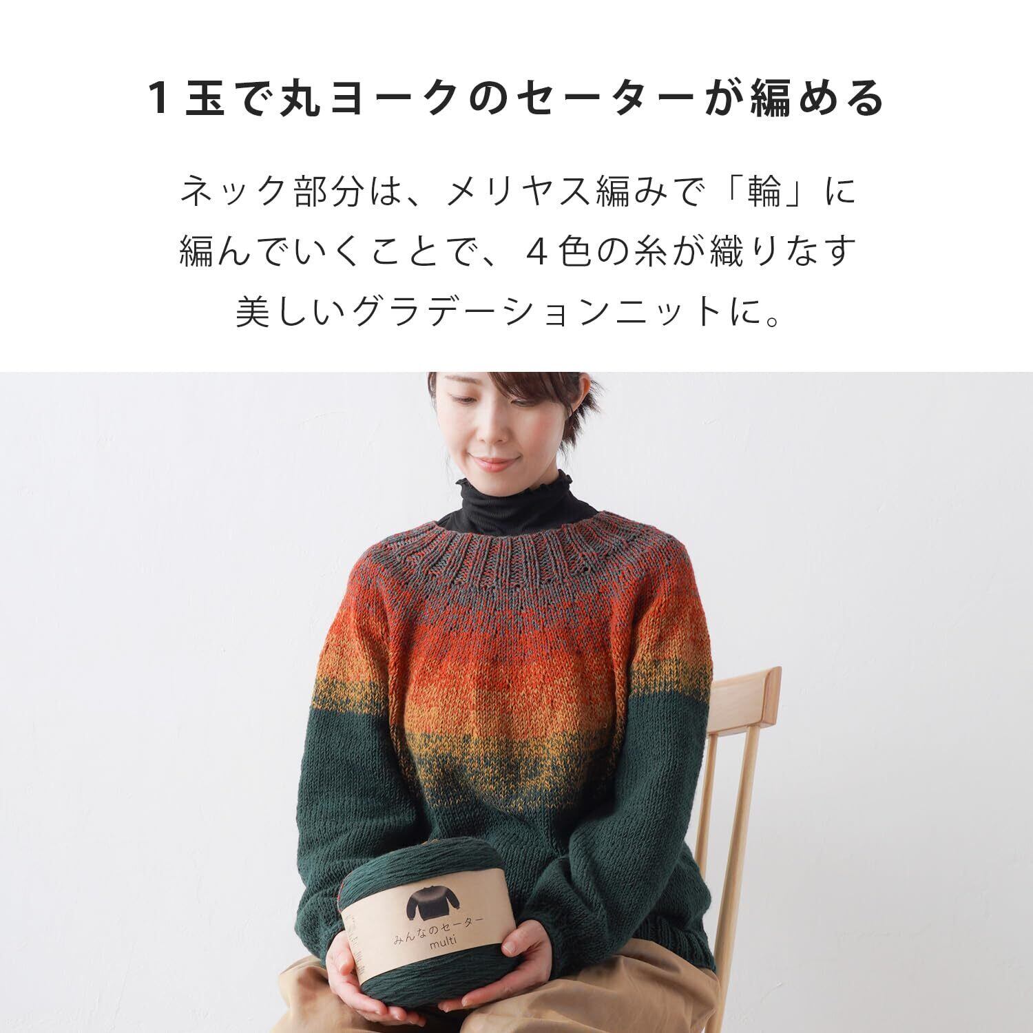 1玉でセーターが編むことができる「みんなのセーターマルチ」は、ヨークの模様は染色プリントではなく、4本引きそろえの糸を1本ずつ色を変えていくことによって作られる美しいグラデーションが特徴です。素材はウールではなくアクリルを採用。軽くて薄手に仕上がるので真冬以外も着られます。