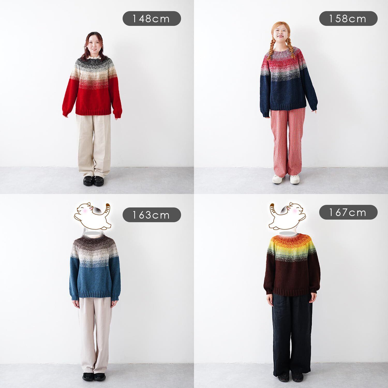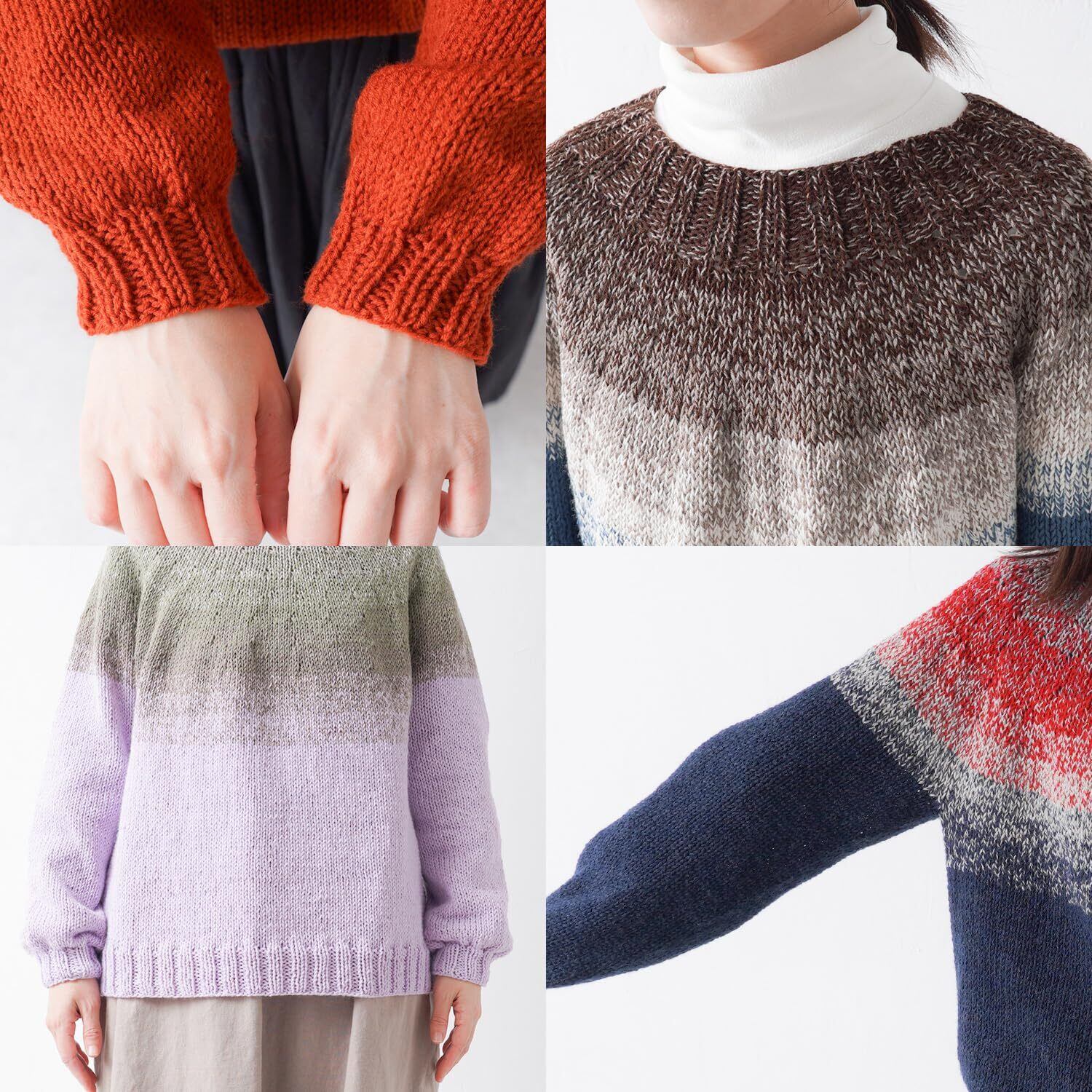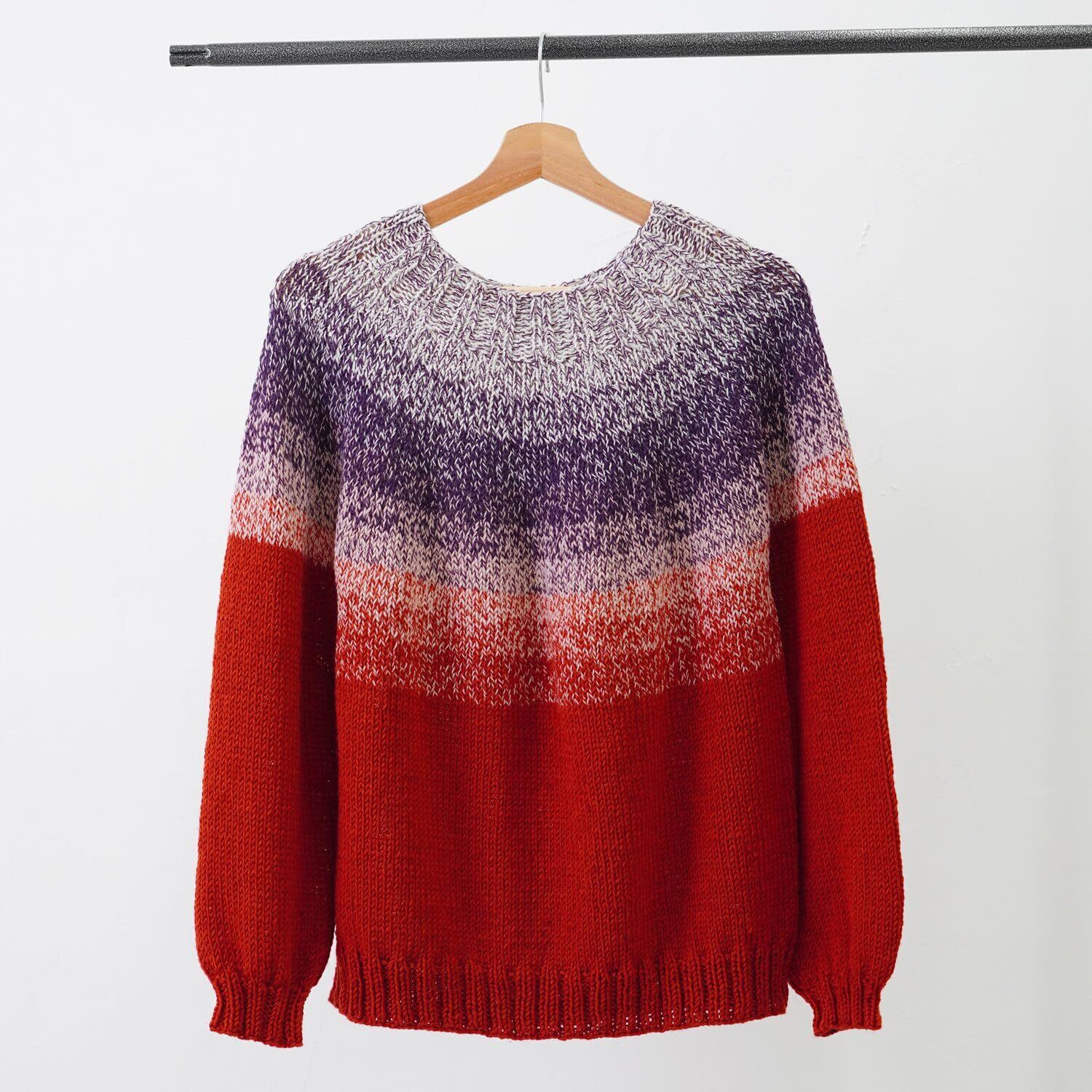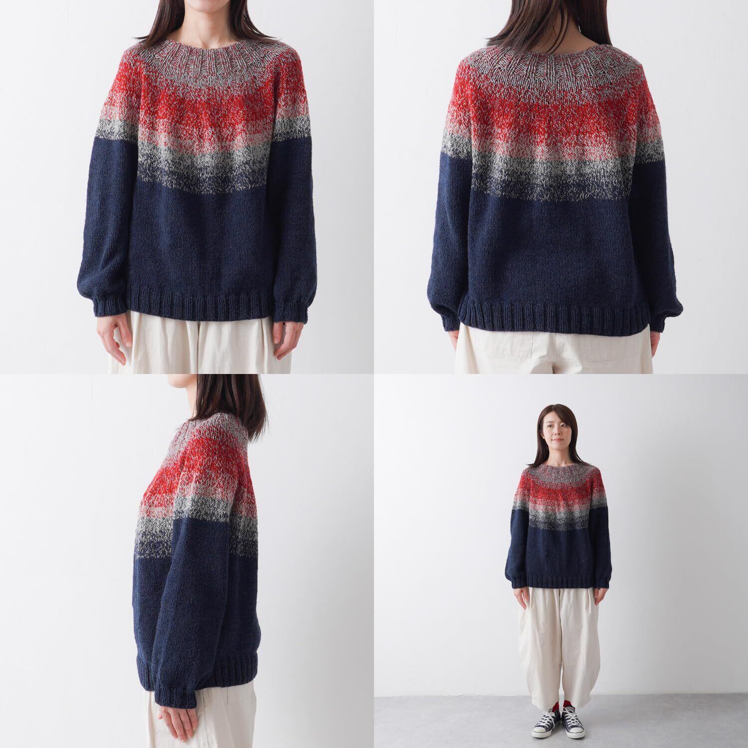 1玉でセーターが編むことができる「みんなのセーターマルチ」は、ヨークの模様は染色プリントではなく、4本引きそろえの糸を1本ずつ色を変えていくことによって作られる美しいグラデーションが特徴です。素材はウールではなくアクリルを採用。軽くて薄手に仕上がるので真冬以外も着られます。