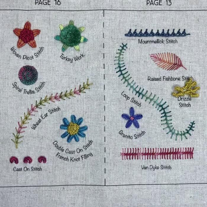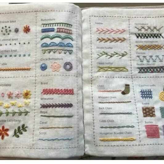 【刺繍のインスピレーションが指先で手に入る】各ステッチに英語でわかりやすいラベルが付いたこのリネン生地の本は、詳細な説明と創造的なインスピレーションを提供し、対応するステッチ名の下で直接ステッチを開始して美しい刺繍作品を作成できます。